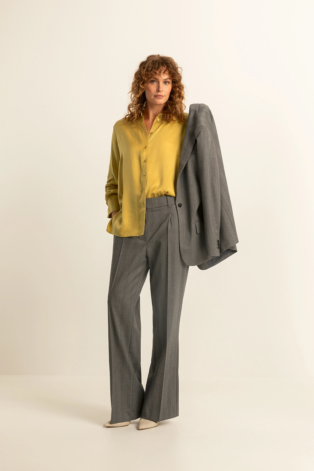 Bandplooibroek met streep in donkergrijs en okergeel – stretchkwaliteit met viscose. Relaxte pasvorm, hogere taille, rechte wijde pijpen. Geweven streep in visgraat-optiek. Stijlvol & trendy in klassieke strepen met een vleugje okergeel. Tip: style een 2-piece city suit met de bijpassende blazer.