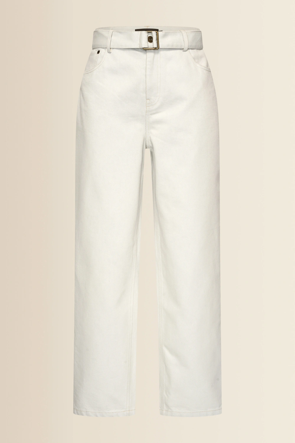 Ecrukleurige jeans – stevige denimkwaliteit met een comfortabele fit. Deze jeans heeft een middelhoge taille, wat zorgt voor een tijdloos silhouet dat moeiteloos combineert. De bijpassende ceintuur met metalen gesp geeft het ontwerp een verfijnde, moderne twist. De lichte wassing maakt deze jeans perfect voor frisse, zomerse looks, maar ook ideaal om door te dragen in het nieuwe seizoen.