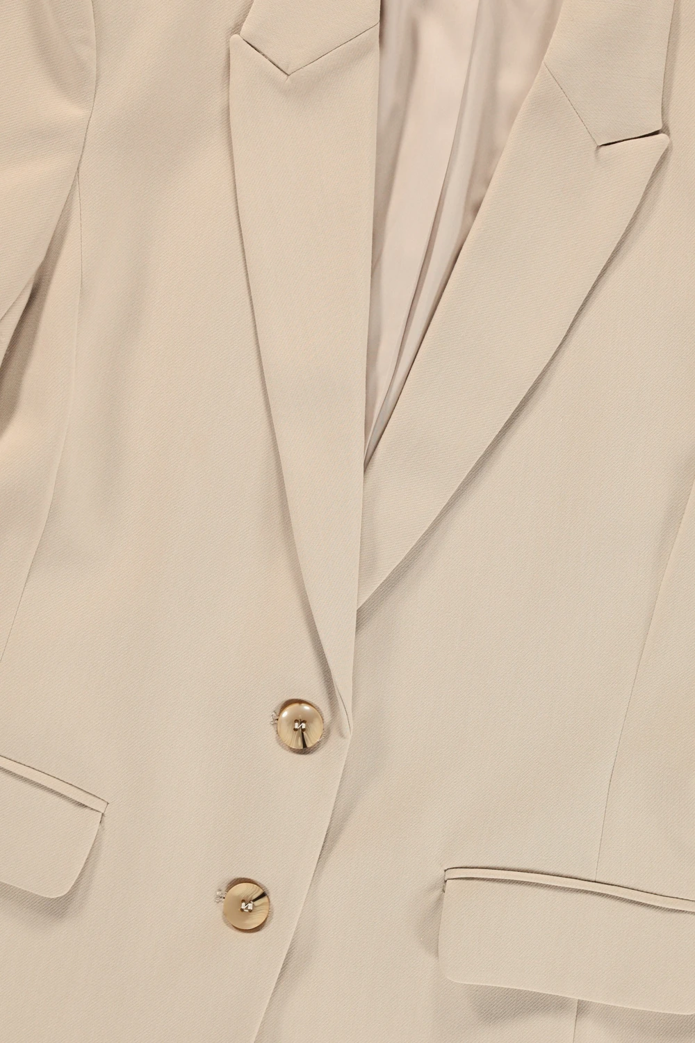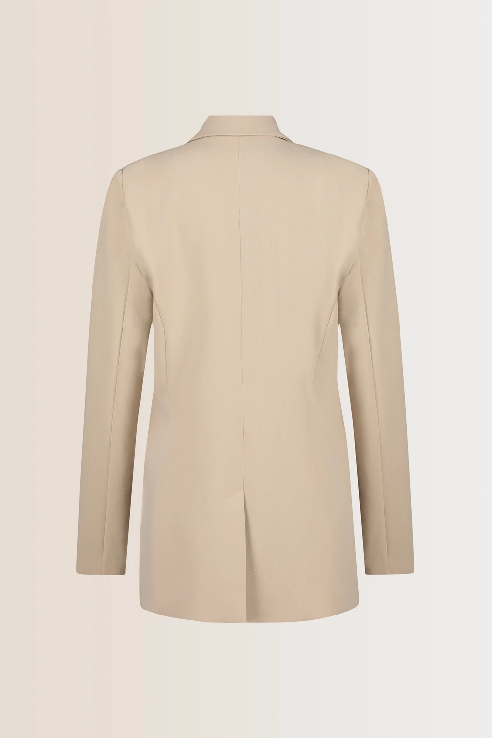 Kitkleurige blazer – stretchkwaliteit met viscose. Licht getailleerd, single-breasted, lengte tot iets over de heup. Iets 'vollere' wintervariant van onze geliefde soepelvallende crêpe. Deze rechter vallende klassieker is een aanwinst om jarenlang plezier van te hebben. Combitip: de bijpassende broek met rechte wijde pijpen.