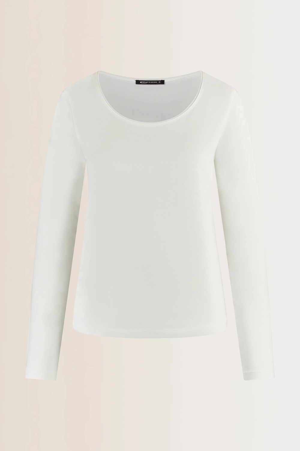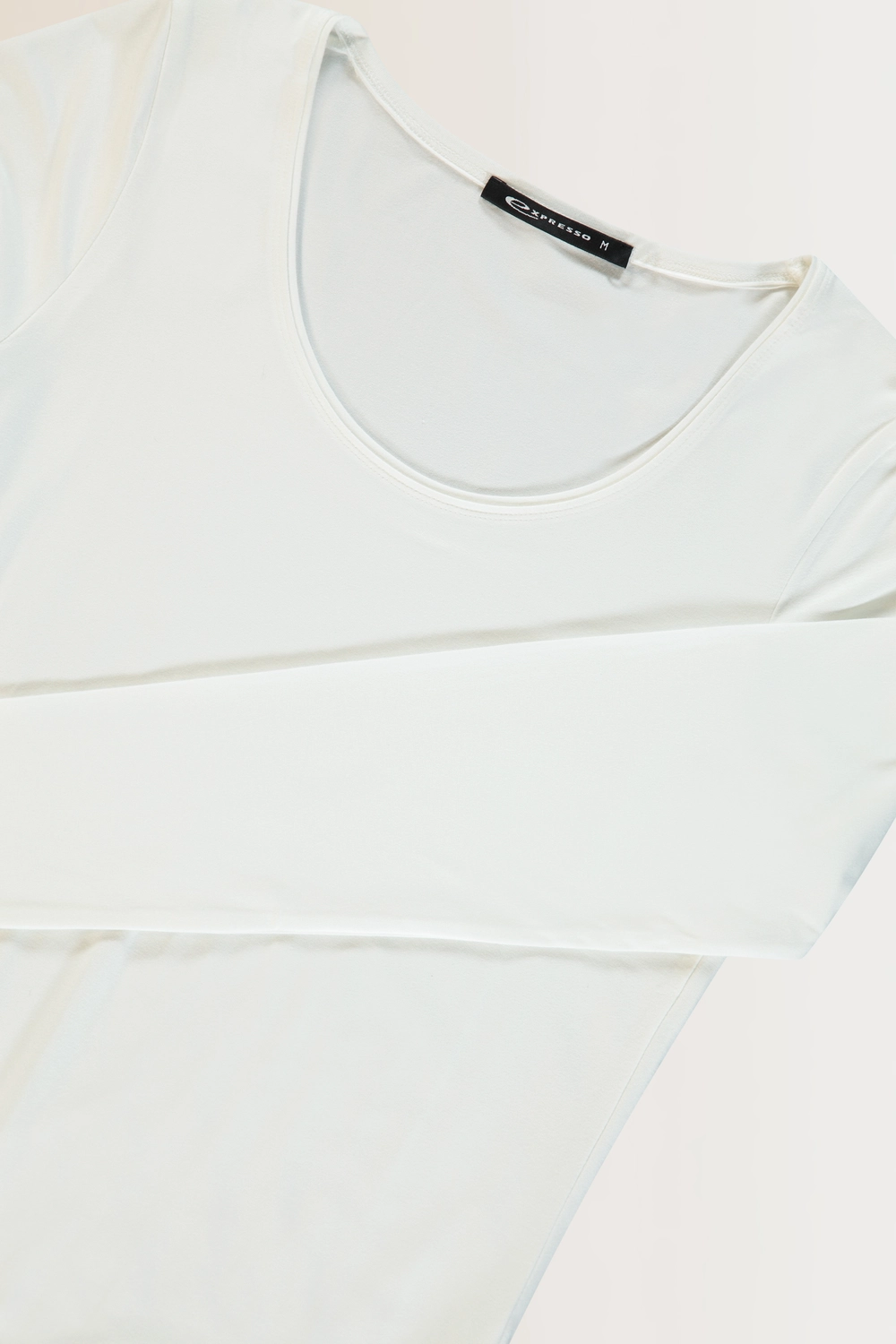 Off-white longsleeve – katoenmix met stretch. Aangesloten model met lange mouwen en een ronde hals. Deze zachte, comfortabele basic vormt de perfecte laag onder blouses, truien en blazers. Dankzij de soepele stof en flatterende pasvorm draag je dit shirt moeiteloos in elke look – van casual tot gekleed.