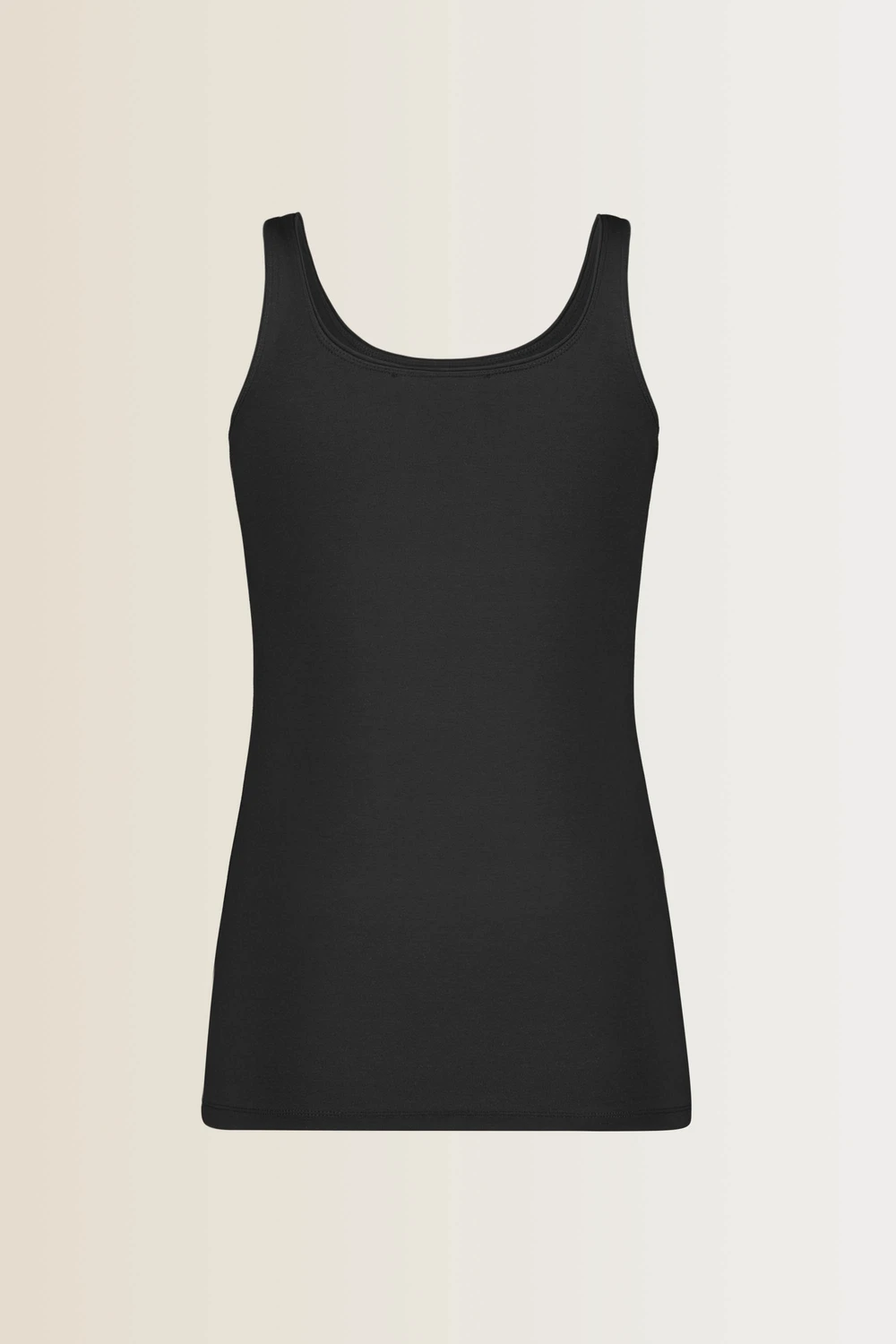 Zwart singlet – katoenmix met stretch. Aansluitend, met een ronde hals en brede bandjes. Deze basic top is een onmisbare aanvulling op je garderobe. Draag 'm onder een blouse of blazer, of combineer met een comfortabele broek voor een minimalistische look. De zachte, elastische stof zorgt voor een flatterende pasvorm en ultiem draagcomfort.