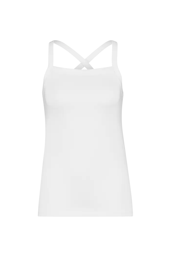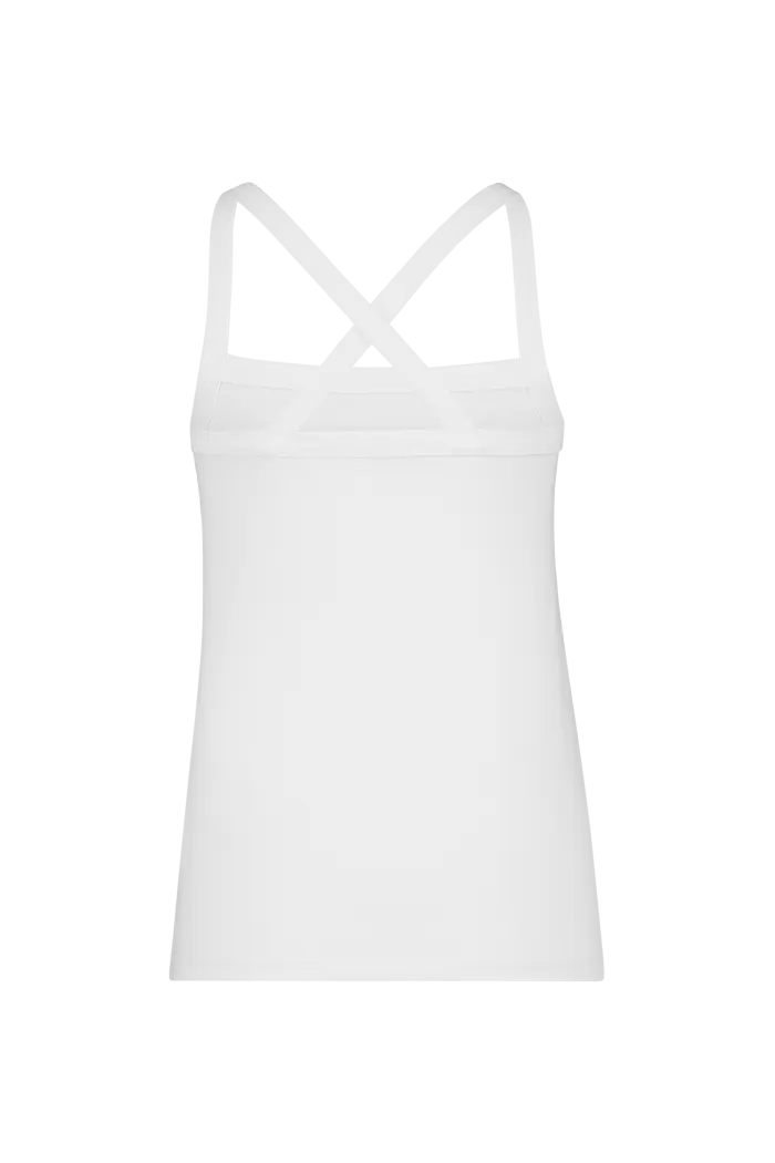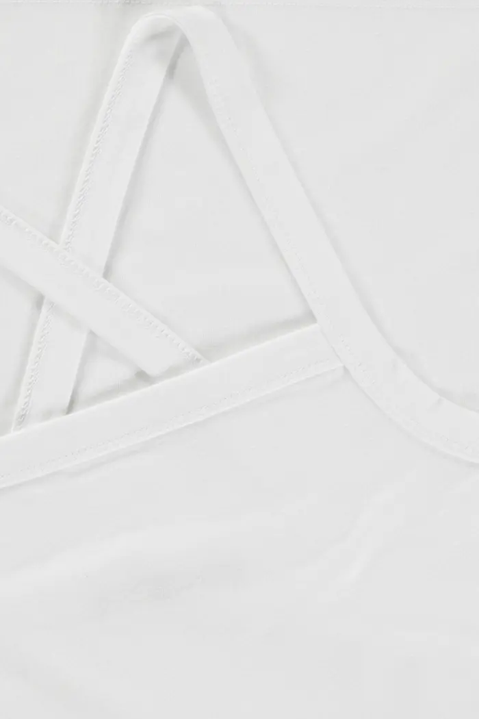 Witte basistop met kruisbanden – stretch viscosemix. Slim-fit, rechte hals voor, kruisbanden op de rug. Soepele stretch jersey, sluit mooi aan. Een makkelijk combineerbare basic met stijlvol rugdetail: onder een transparante blouse of trui blijven de kruisbandjes subtiel zichtbaar.