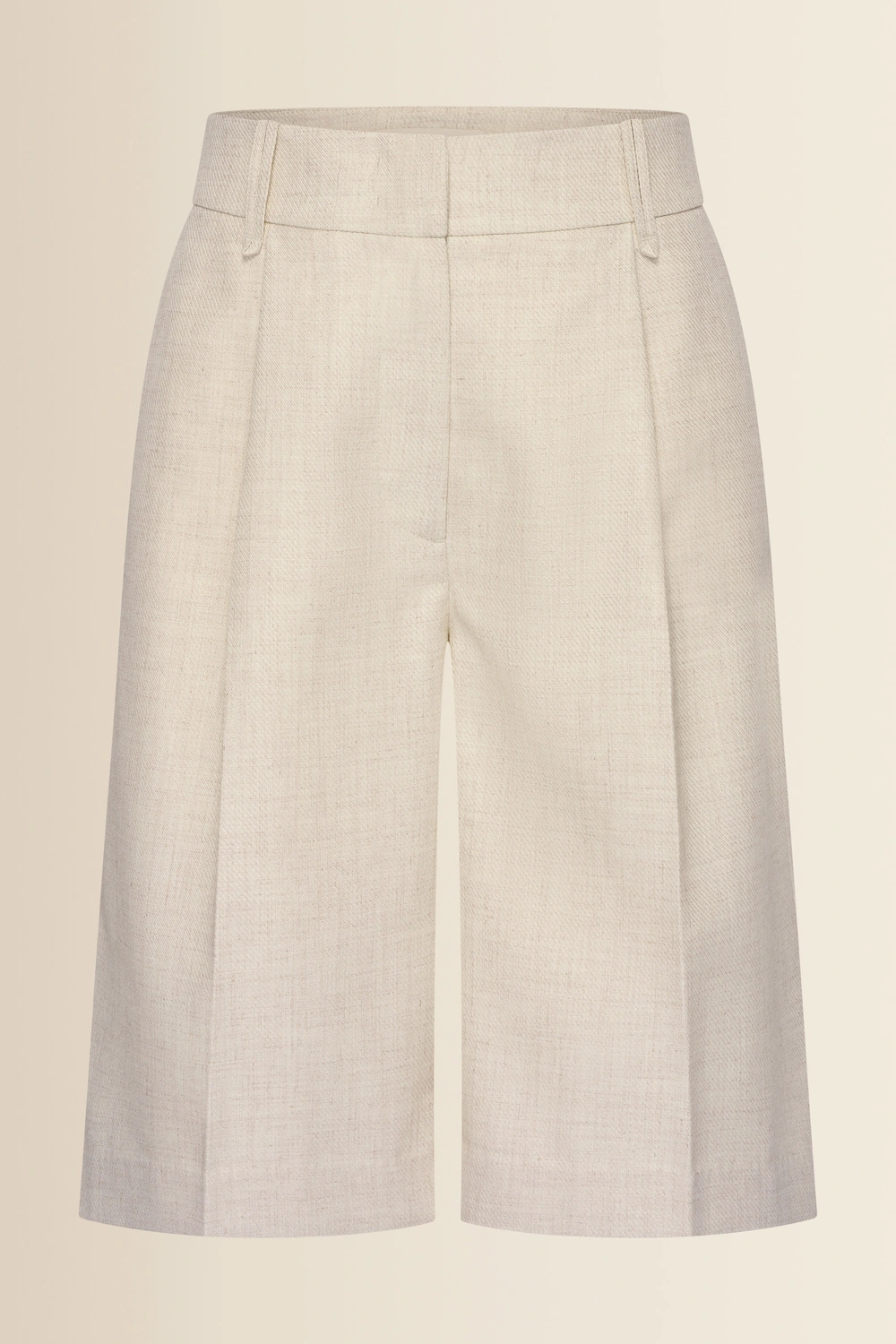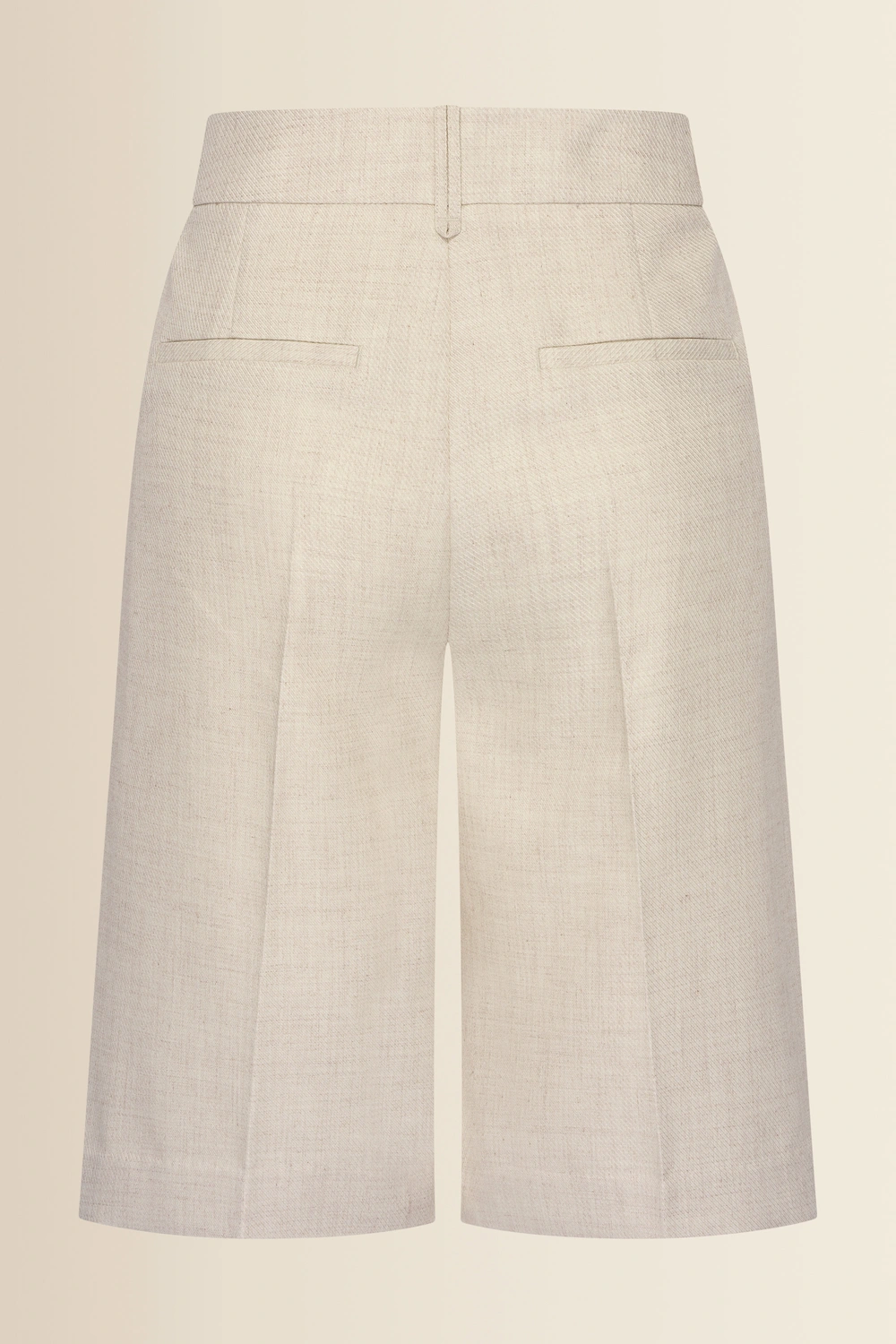 Lichtbeige bermuda – geweven kwaliteit met een subtiele structuur en een natuurlijke, elegante uitstraling. Hoog in de taille en soepelvallend, met wijde cropped pijpen, riemlussen en een persvouw die het silhouet mooi verlengt. De cleane afwerking en comfortabele fit maken deze bermuda tot een stijlvol item dat moeiteloos klasse toevoegt aan iedere outfit.