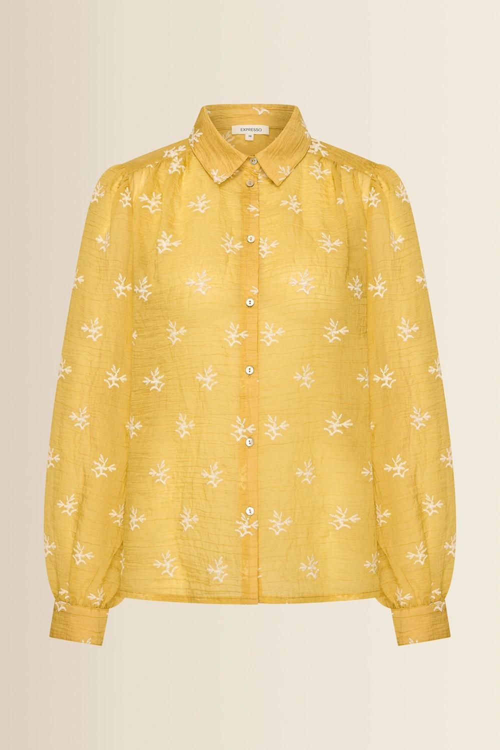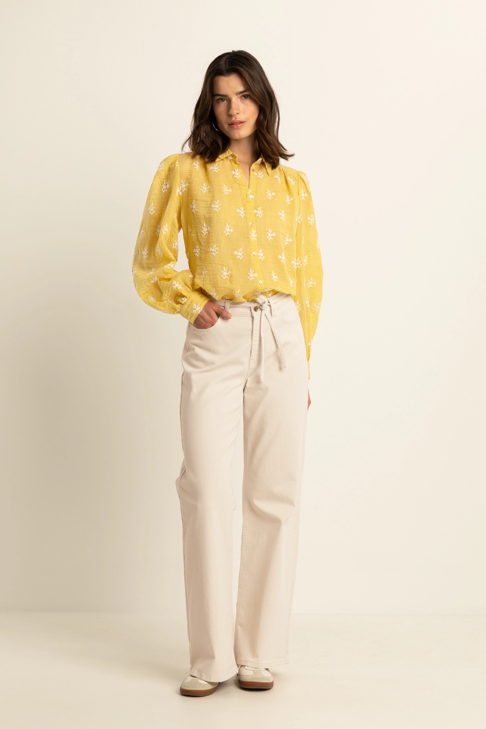 Gele blouse met borduursels – luchtige kwaliteit met een zomerse uitstraling. Deze vrouwelijke blouse is uitgevoerd met een klassieke kraag, knoopsluiting en lange mouwen met een zachte pof en manchet. De witte geborduurde motieven geven het item een verfijnd en expressief karakter, terwijl de lichte stof comfortabel draagt en mooi valt.