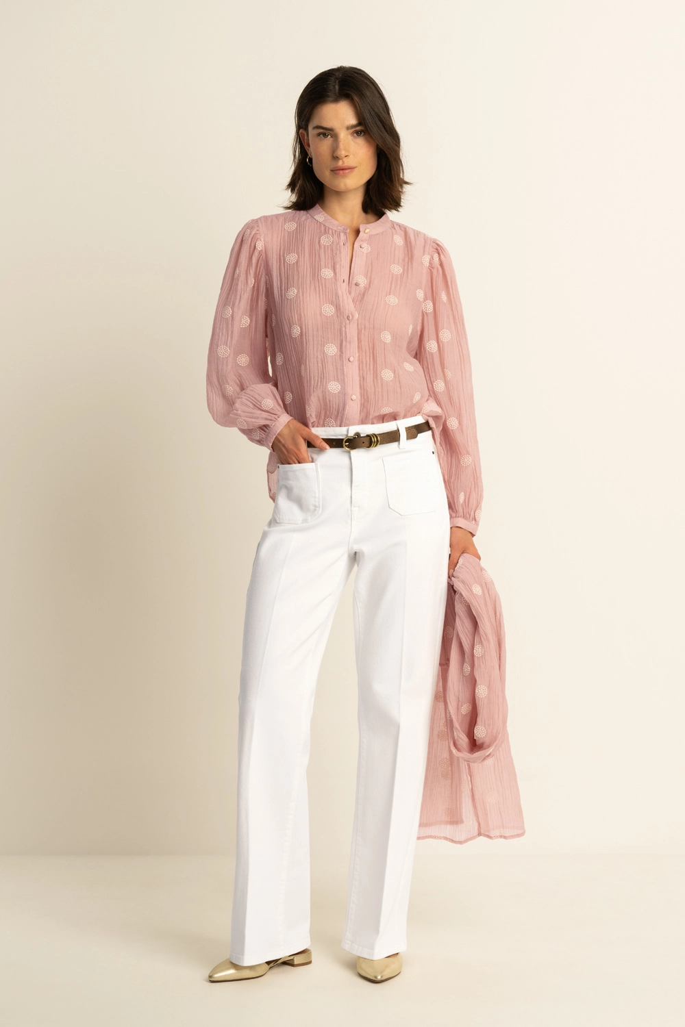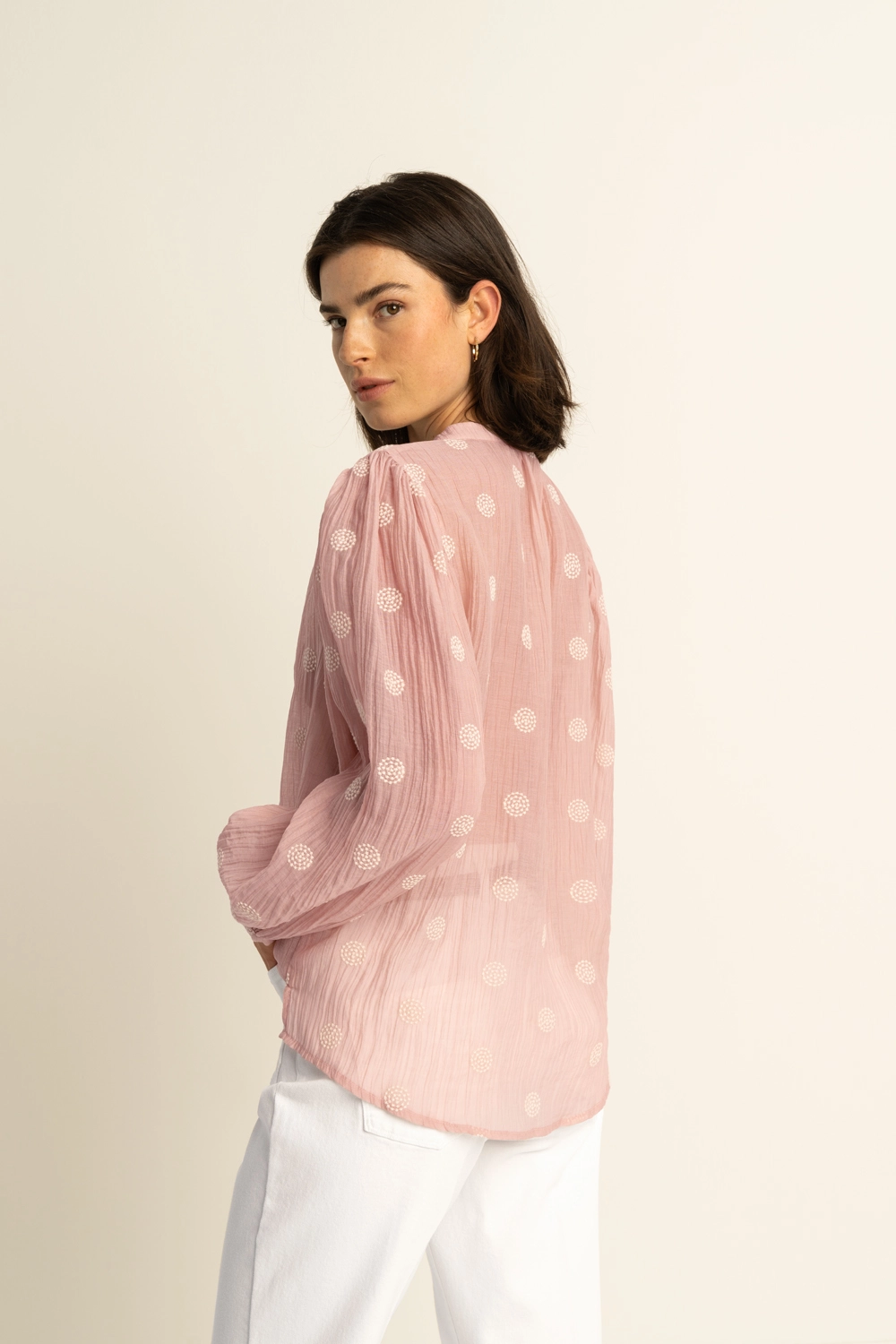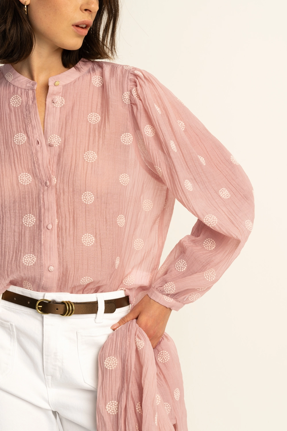 Lichtroze blouse – luchtige kwaliteit met verfijnde geborduurde details voor een zachte, vrouwelijke uitstraling. Recht en soepel vallend, met een mandarijn kraag, knoopsluiting en lange mouwen met lichte rimpeling bij de schouders. De crinkle-structuur en het subtiele borduurwerk geven deze blouse een romantische uitstraling.
