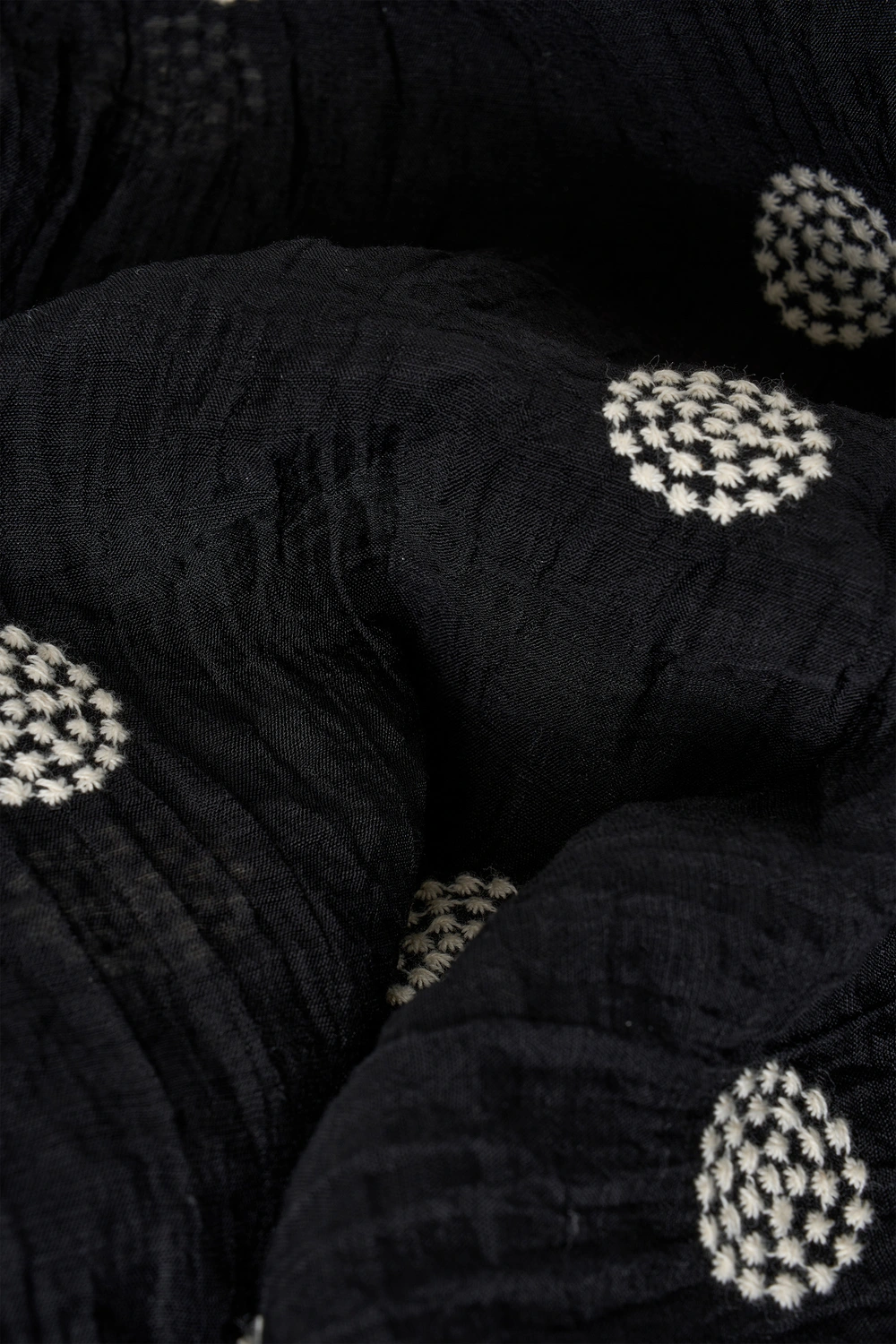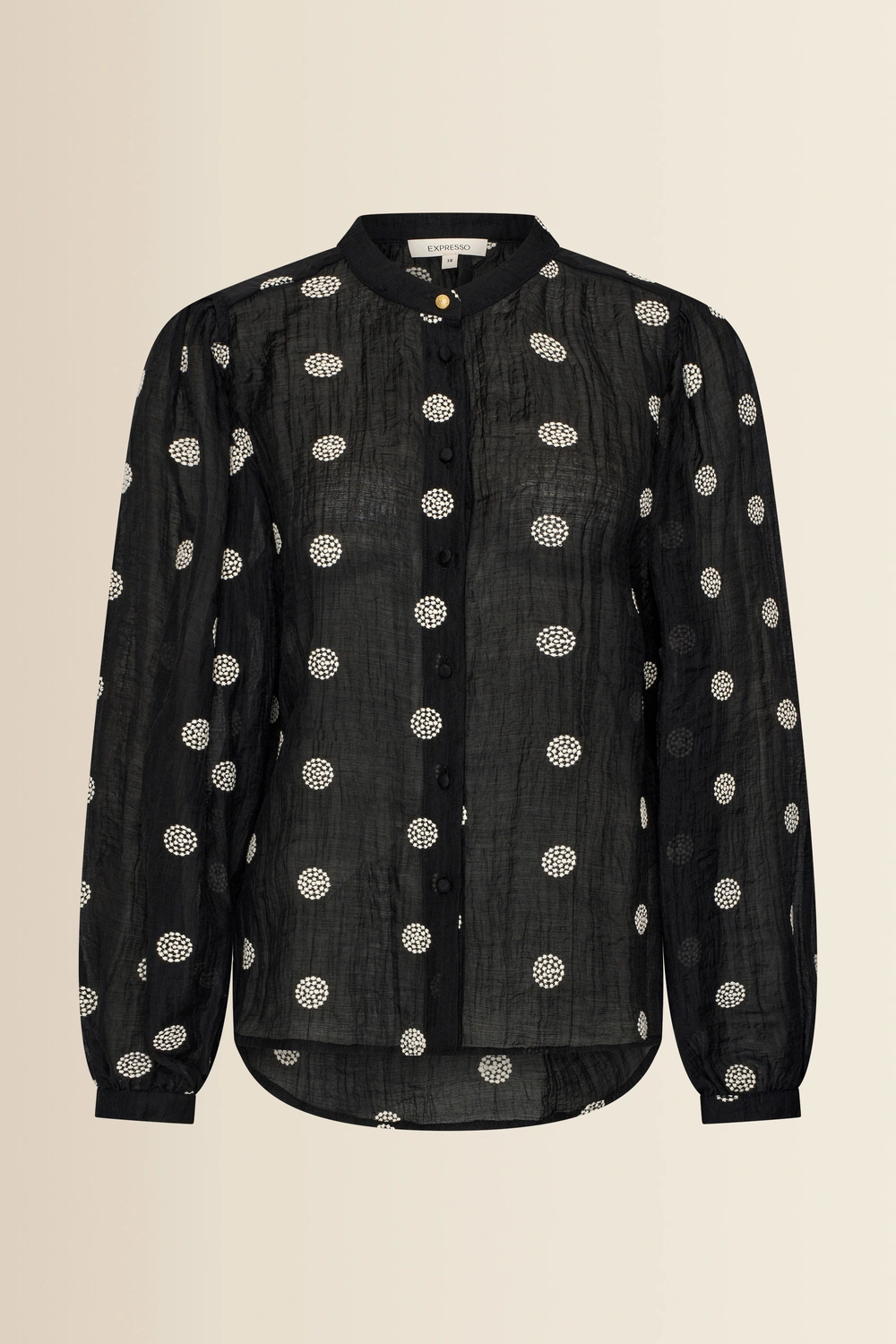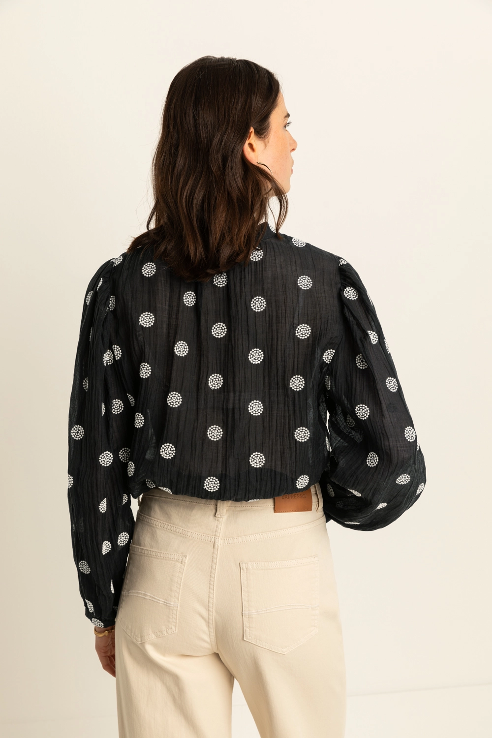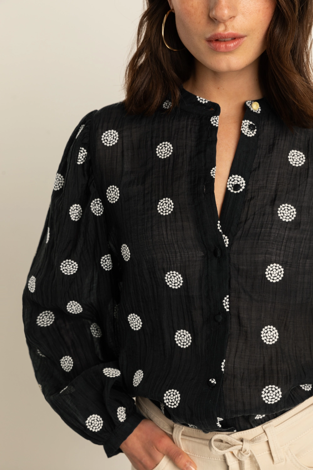 Zwarte blouse – luchtige kwaliteit met verfijnde geborduurde details voor een zachte, vrouwelijke uitstraling. Recht en soepel vallend, met een mandarijn kraag, knoopsluiting en lange mouwen met lichte rimpeling bij de schouders. De crinkle-structuur en het subtiele borduurwerk geven deze blouse een romantische uitstraling.