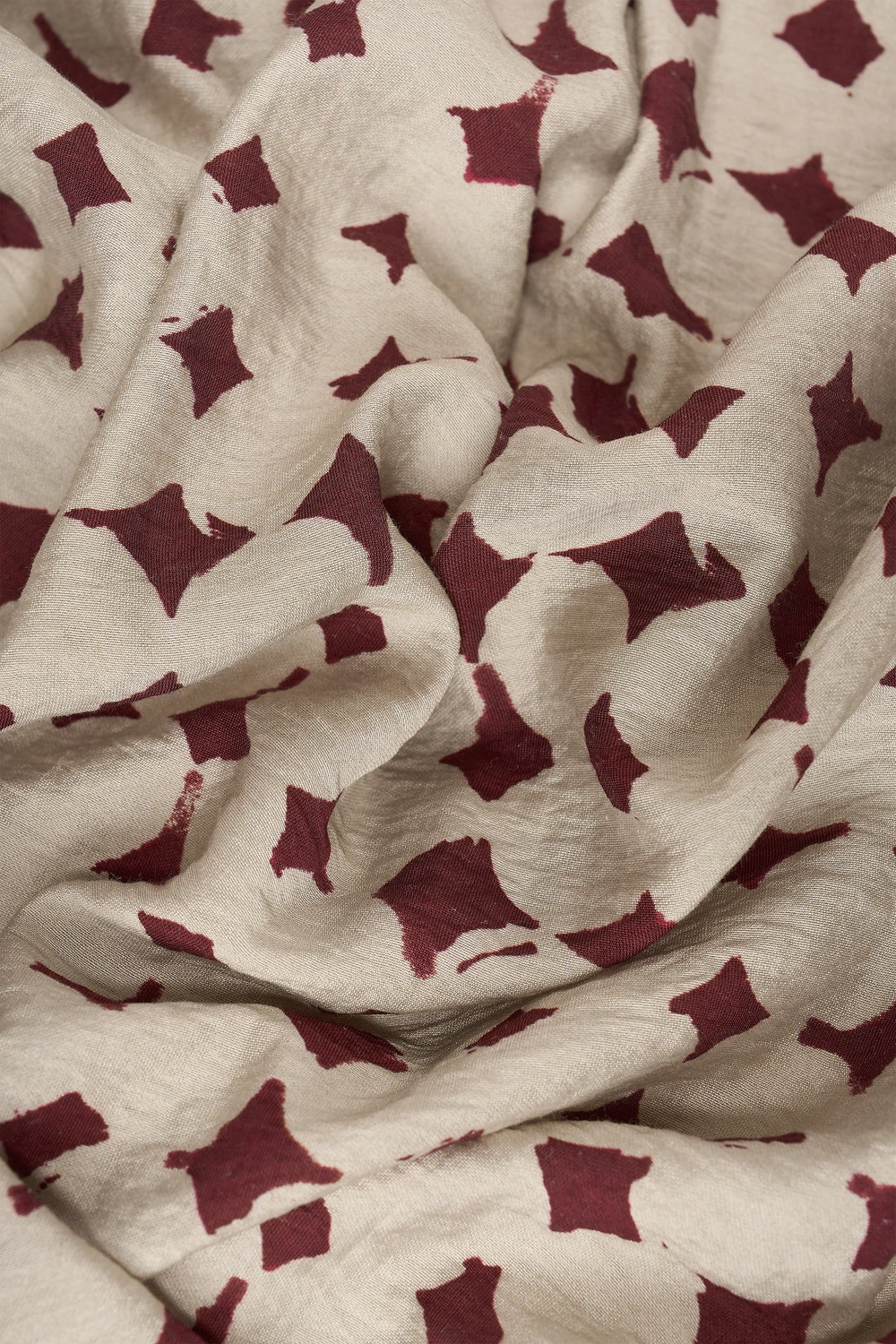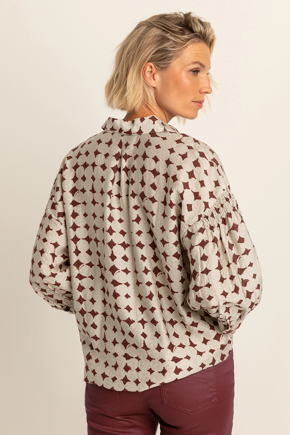 Beige-bordeaux blouse – met borduursel. Losvallend en licht bloezend, met een klassieke kraag, 3/4-mouwen en een afgeronde zoom. De grafische print in warm bordeaux en het goudkleurige borduursel maken deze blouse een opvallend en stijlvol item. Het luchtige materiaal en de verfijnde details zorgen voor een luxe uitstraling, perfect voor zowel een casual look als een avondje uit.