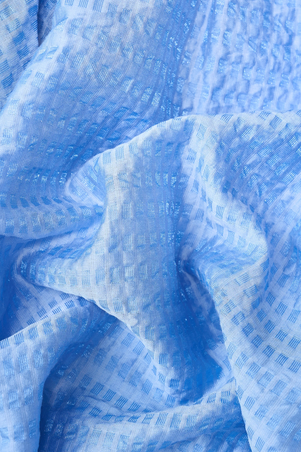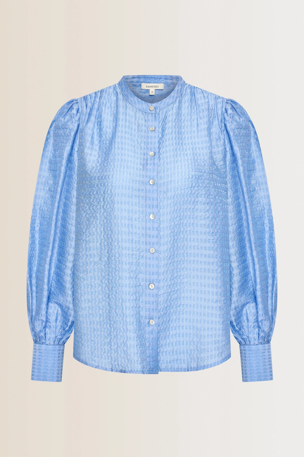 Blauwe blouse – glanzende jacquard met subtiele structuur. Losvallend model met een hoge, ronde kraag en lange pofmouwen. De delicate glans en de fijne structuur geven deze blouse een elegante en moderne uitstraling, perfect voor zowel zakelijke als feestelijke gelegenheden.