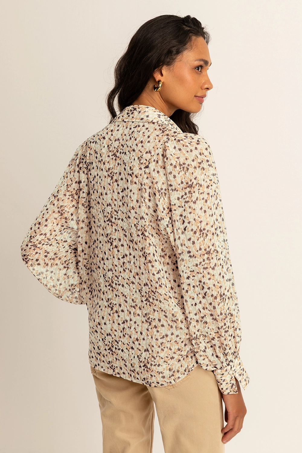 Blouse met print – Lichtgewicht en soepelvallend, met een verfijnde kraag, doorknoopsluiting en lange mouwen met manchetten. De subtiele plooistructuur en all-over print in zachte beige- en paarstinten met een subtiel gouden streep geven de blouse een speels en vrouwelijk karakter. Perfect voor een gelaagde look onder een blazer of casual op een jeans.
