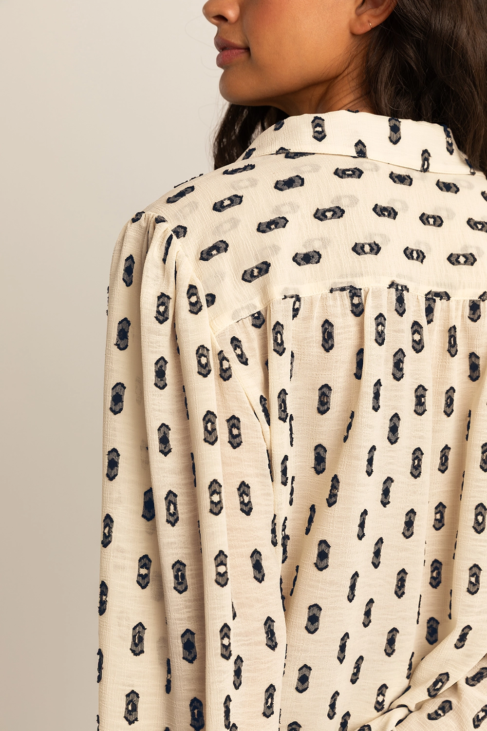 Crèmekleurige blouse – met zwart grafisch dessin. Recht model met klassieke kraag, zwarte knooplijst en manchetten. De licht transparante stof en subtiel geplooide schouders geven de blouse een verfijnde uitstraling, perfect voor zowel zakelijke als casual combinaties. Tip: draag met een zwarte pantalon en enkellaarsjes voor een elegante look.