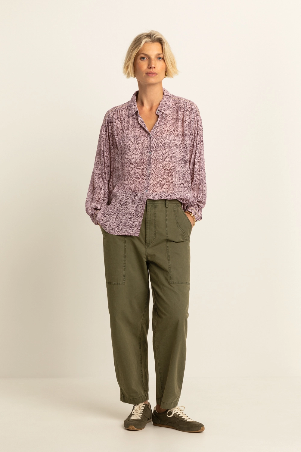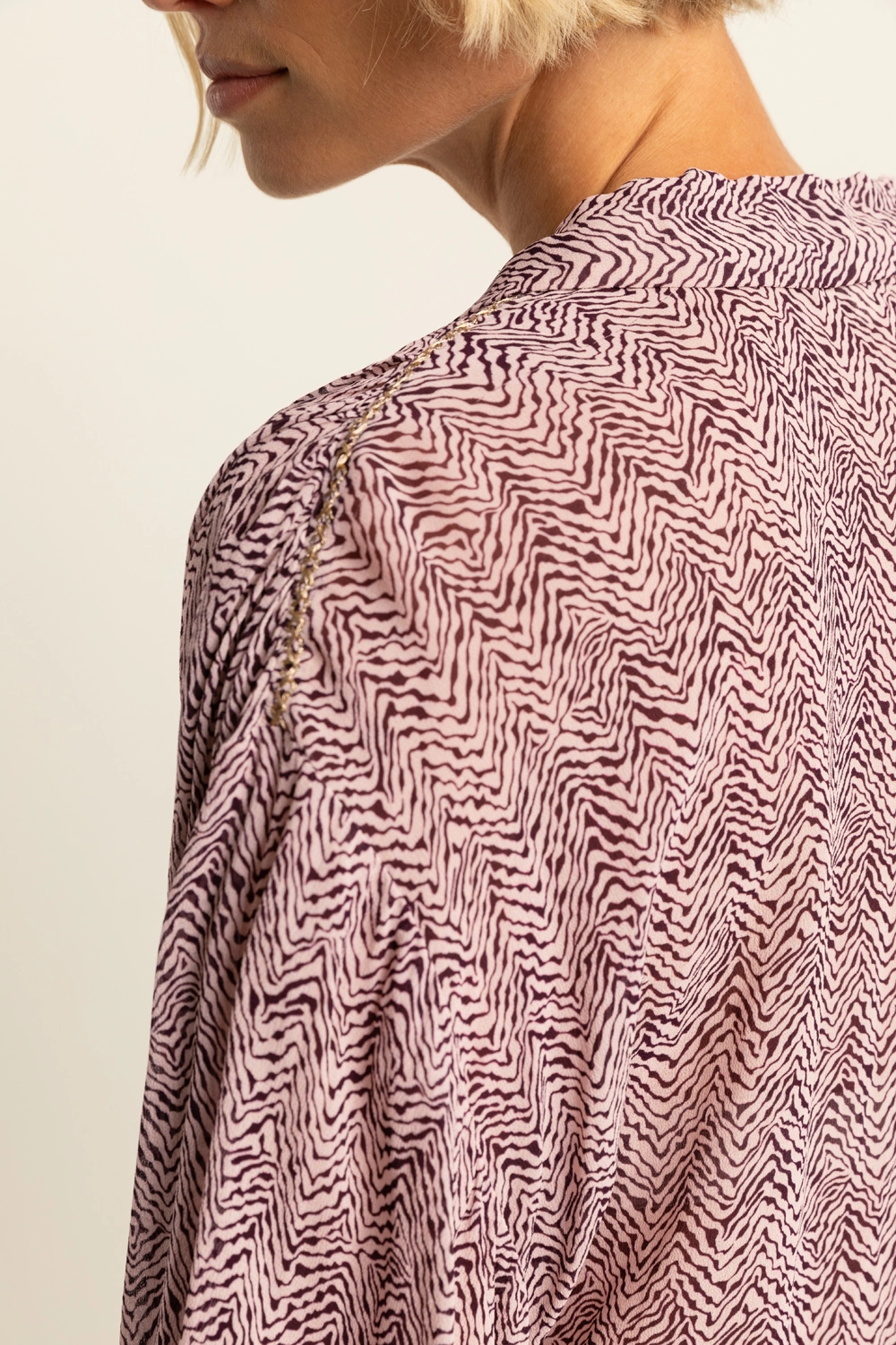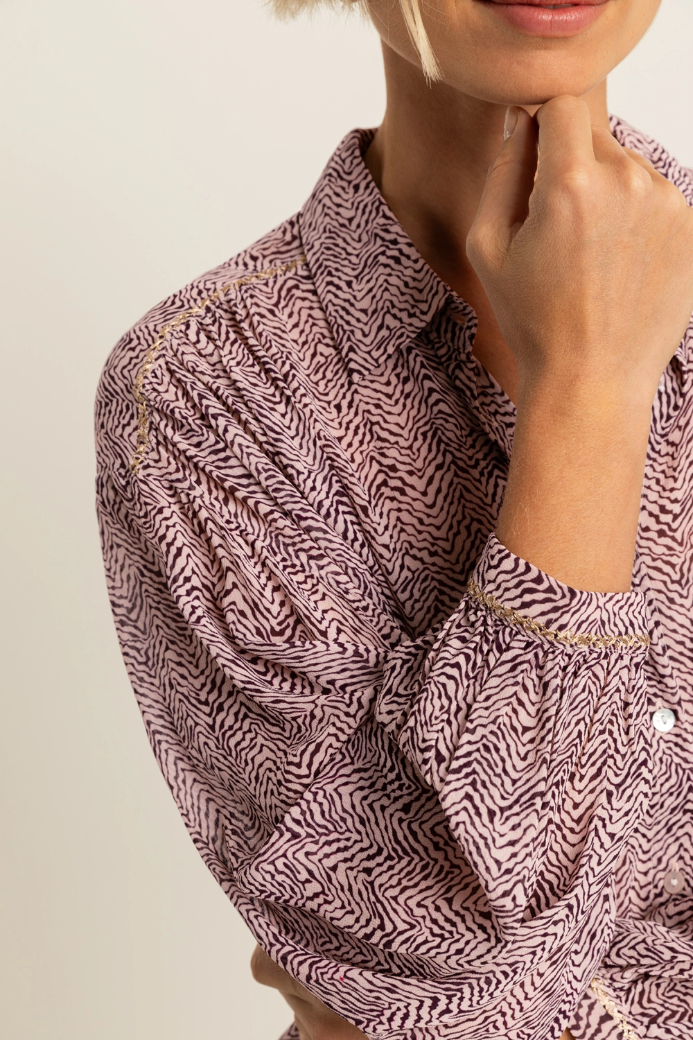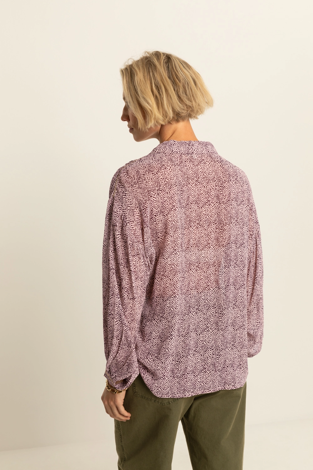 Bordeauxrode blouse met grafische print – luchtige geweven kwaliteit met een expressief, golvend dessin. Recht en soepel vallend, met een klassieke kraag, knoopsluiting en lange mouwen met manchetten. De bordeauxrode print geeft deze blouse een krachtige, vrouwelijke uitstraling, terwijl de lichte stof zorgt voor comfortabel draaggemak.