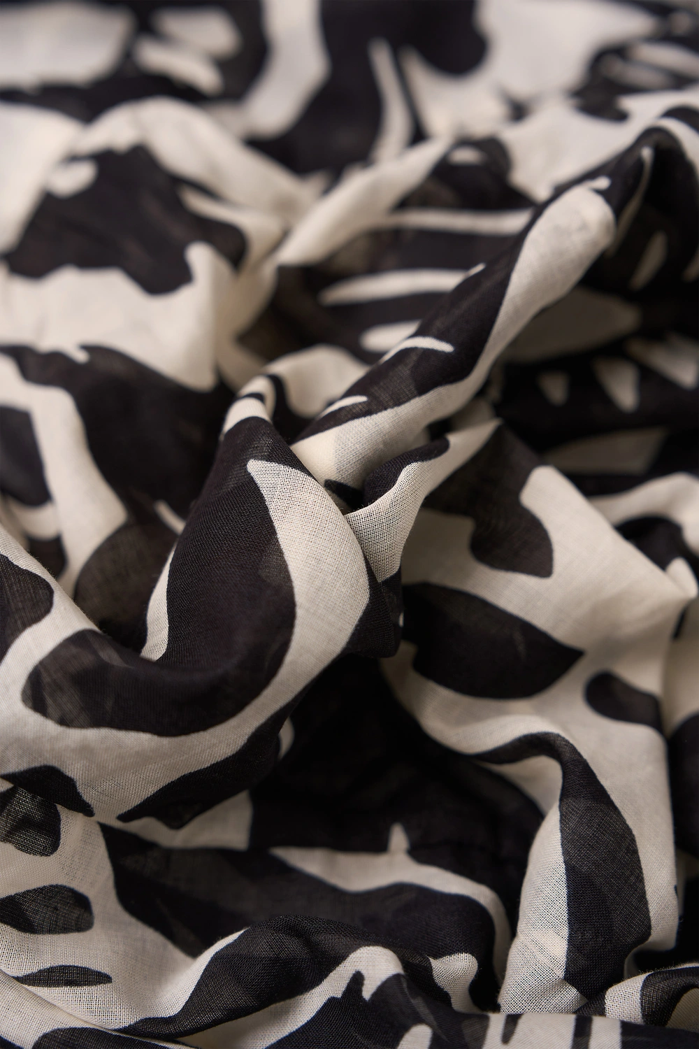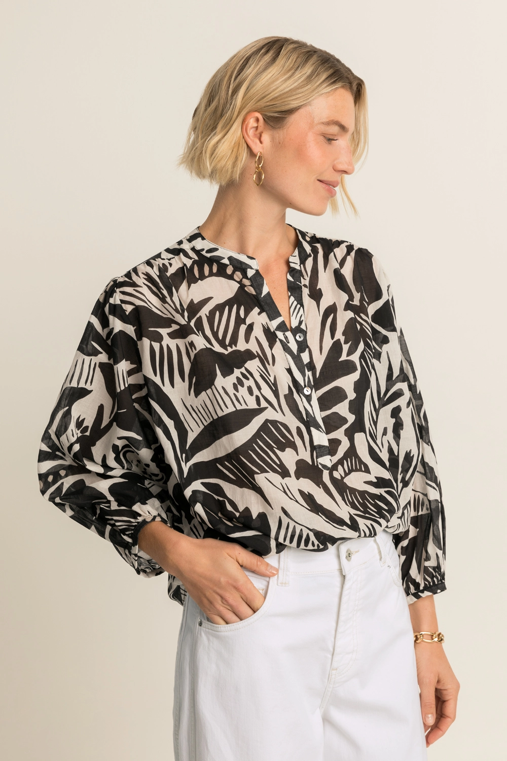 Zwart-witte blouse met print – luchtige, soepelvallende stof met een grafisch bladmotief. Losvallend en vrouwelijk, met een ronde hals met split en driekwart ballonmouwen. De expressieve print en volumineuze mouwen geven deze blouse een krachtige uitstraling, terwijl de luchtige kwaliteit zorgt voor een comfortabele fit.