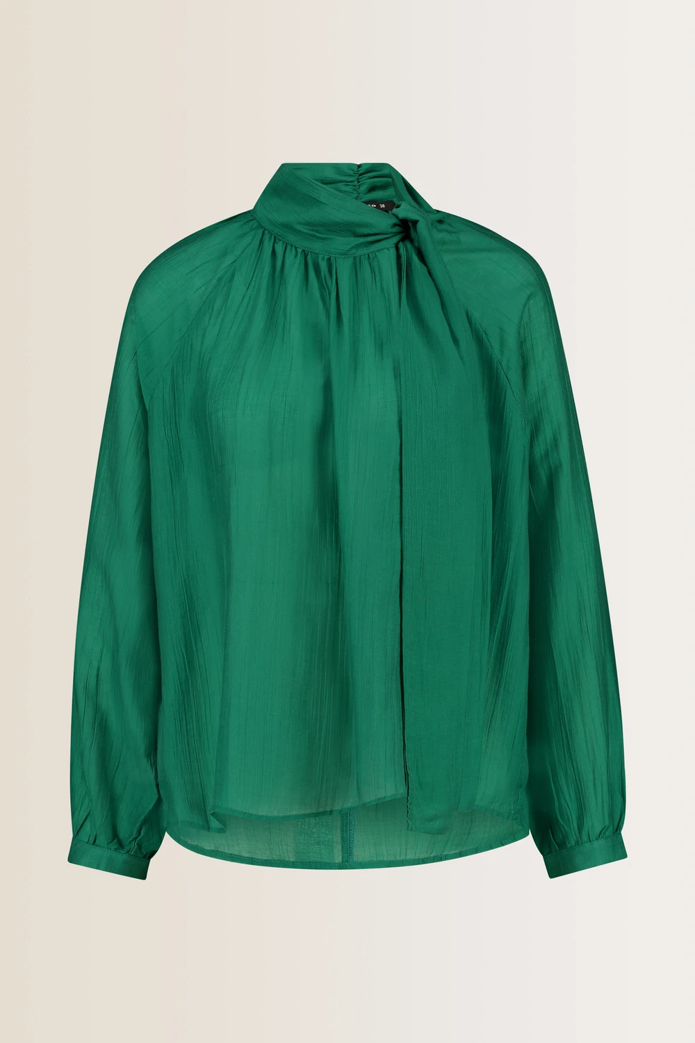 Flessengroene blouse – lyocell mix. Ruimvallend, colkraag met asymmetrische strik, lange raglanmouwen. Lichte, semi-transparante crinklestof. Geeft elke look een vrouwelijke finishing touch. Tip: stijlvolle upgrade voor casual jeans.