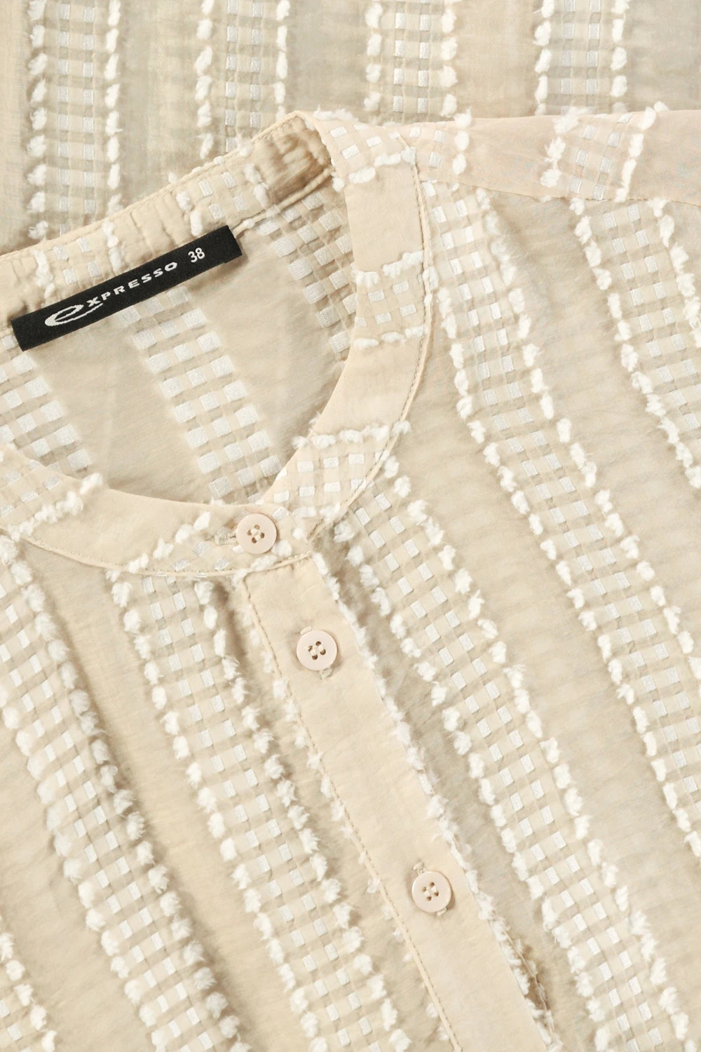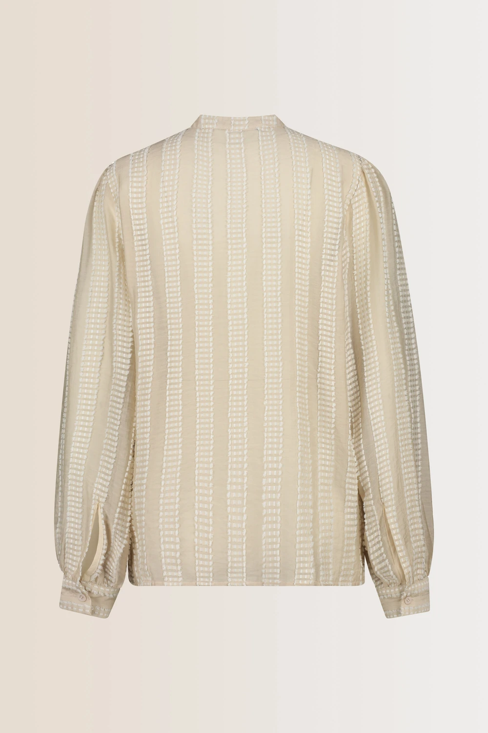 Kitkleurige blouse – semi-transparante structuurstof. Recht & relaxed, smalle halsboord, bloezende pofmouwen. Licht glanzend, streepstructuur met franje. Een vleugje vrouwelijke boho-chic voor je herfstgarderobe.