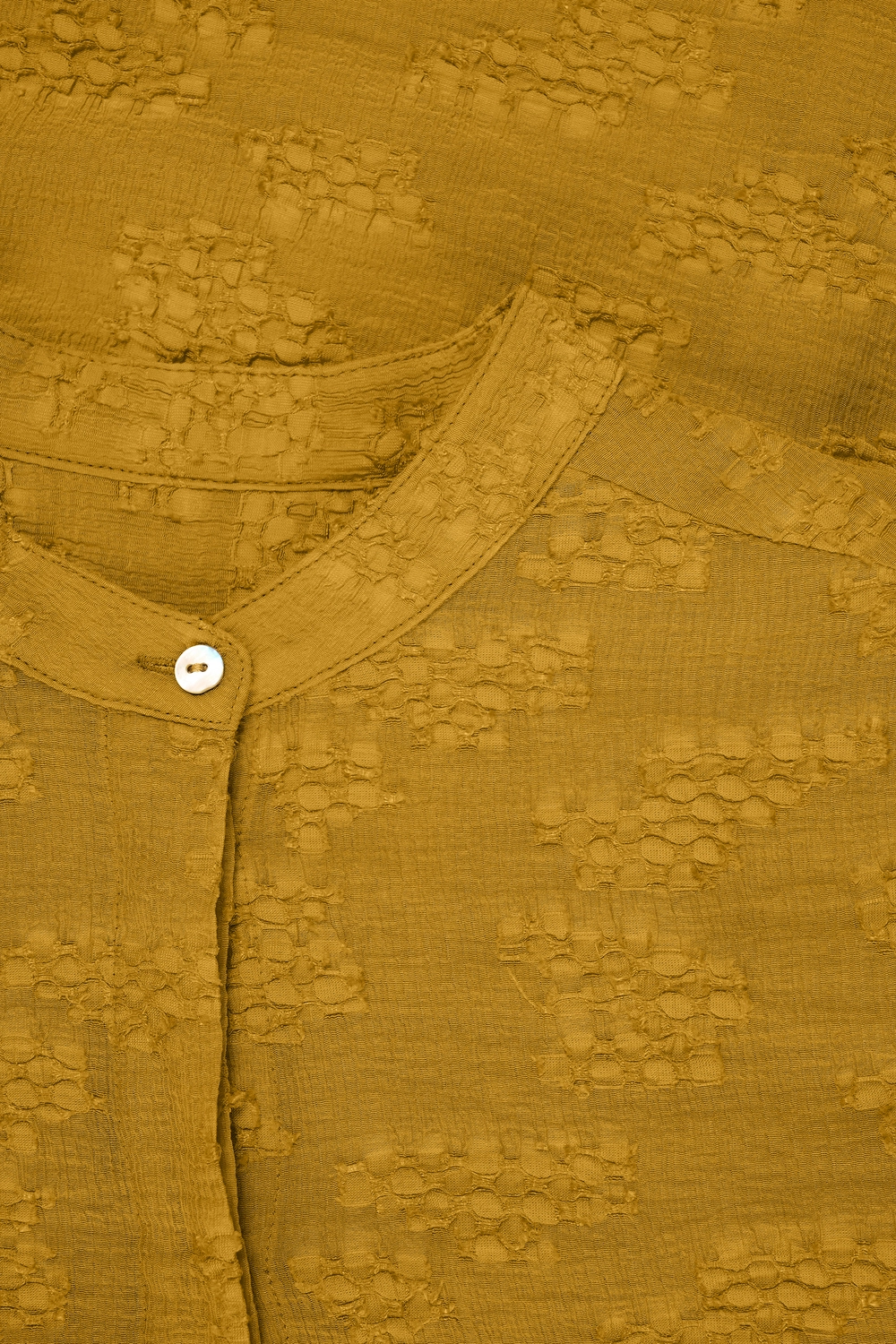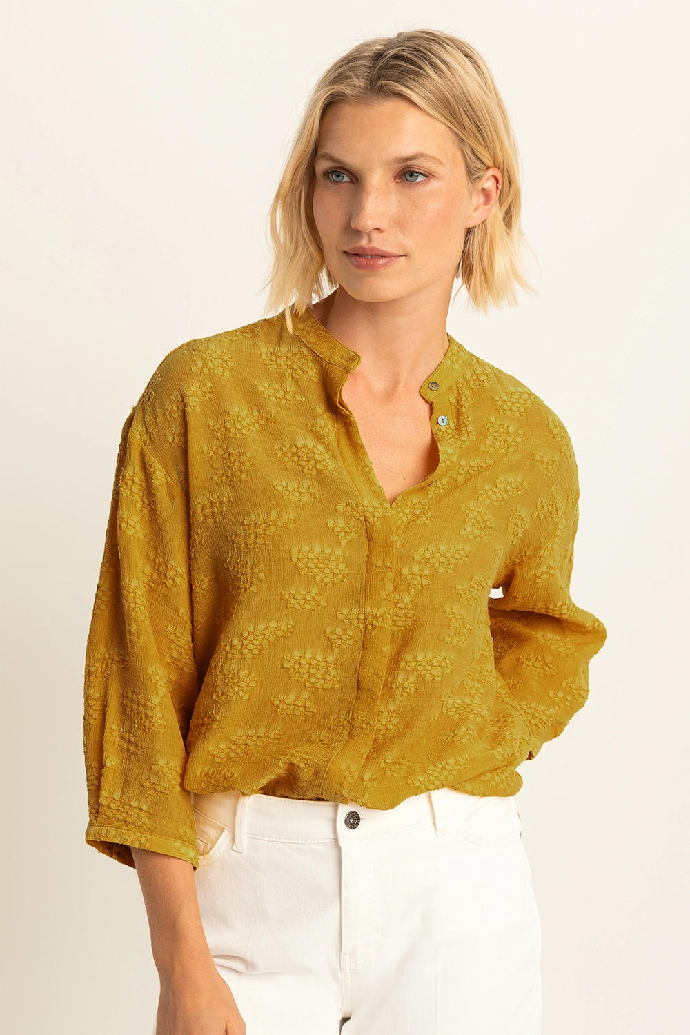 Gele blouse – soepelvallende viscosemix. Relaxed en licht oversized, met een opstaande kraag en subtiele structuur in de stof. Deze blouse is de perfecte balans tussen casual en verfijnd, met een zachte, luchtige feel die ideaal is voor elk seizoen. Draag het open als een lichte layering piece of gesloten voor een gestroomlijnde look.