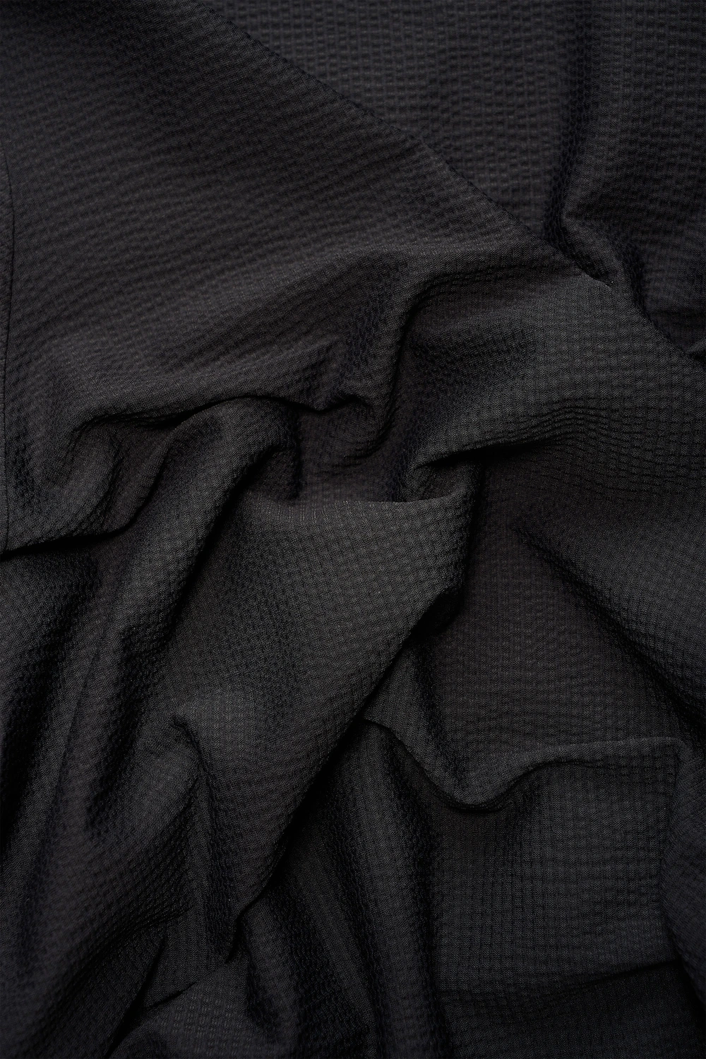 Zwarte blouse – losvallend model in een subtiel gestructureerde stof. Het model heeft een vrouwelijke V-hals en 3/4de ballonmouwen met manchetten en knoopsluiting. De soepele pasvorm maakt het een veelzijdig stuk, geschikt voor zowel werk als vrije tijd. Draag met een aangesloten pantalon voor een elegante look, of combineer met jeans voor een meer casual uitstraling.