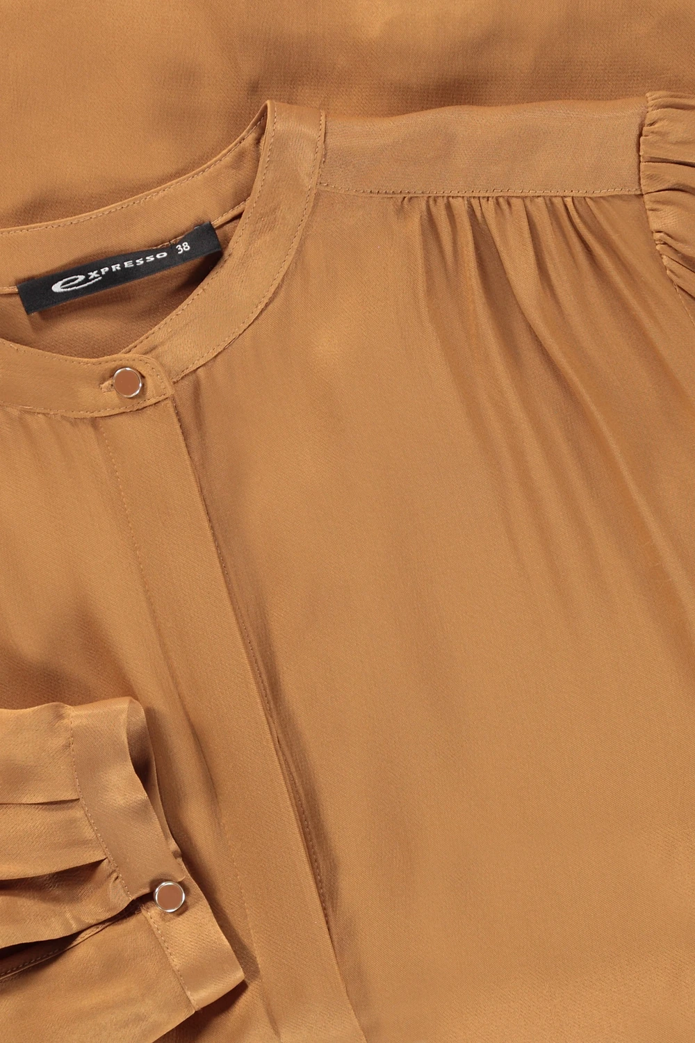 Blouse in een warme cameltint – viscose. Recht & relaxed, smalle halsboord, poffende driekwartmouwen. Glanzend satijn, glad en soepel. Luxe basisblouse, makkelijk combineerbaar. Met de bijpassende broek een stijlvolle set voor werkdag of date night.