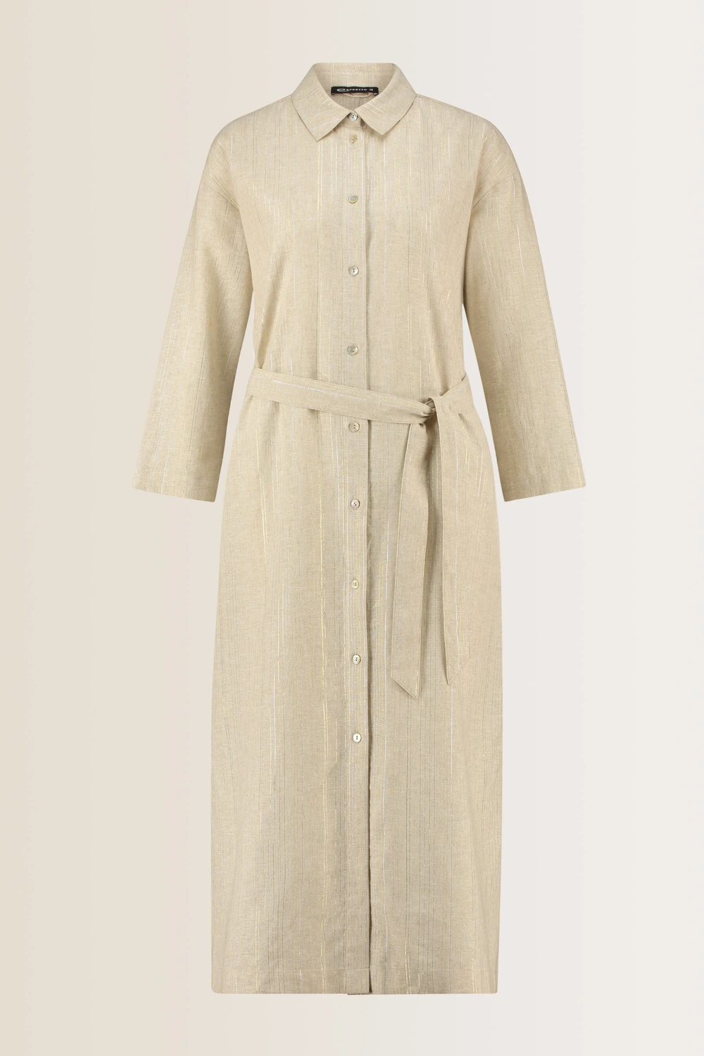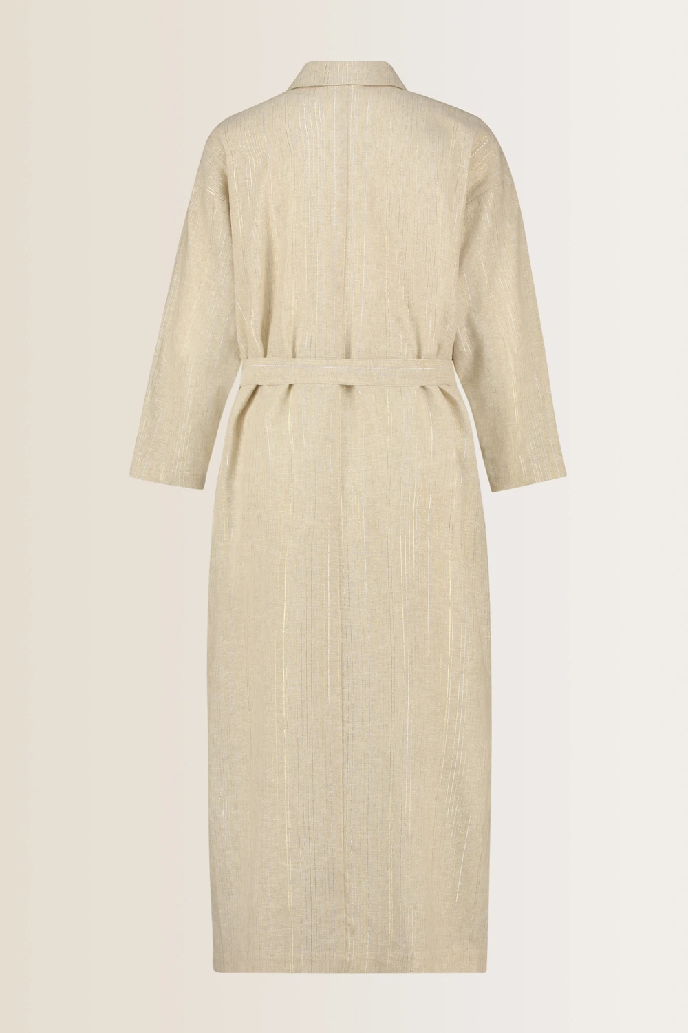 Beige hemdjurk – linnenmix. Rechte pasvorm met ceintuur, lange mouwen, midi lengte. De stof heeft een subtiele glans en een lichte structuur. Deze hemdjurk is perfect voor een elegante, maar ontspannen look, ideaal voor zowel zakelijke als casual gelegenheden. Draag het als een jurk - met of zonder ceintuur- of opengeknoopt als een lange blouse, ook leuk over shorts.