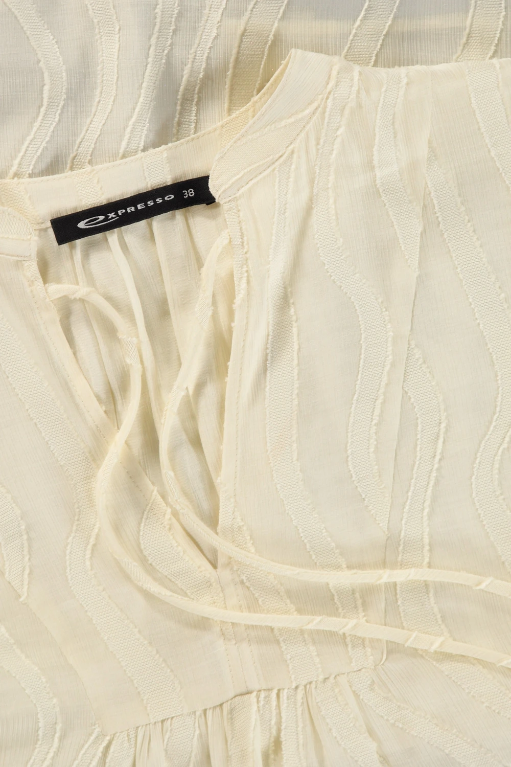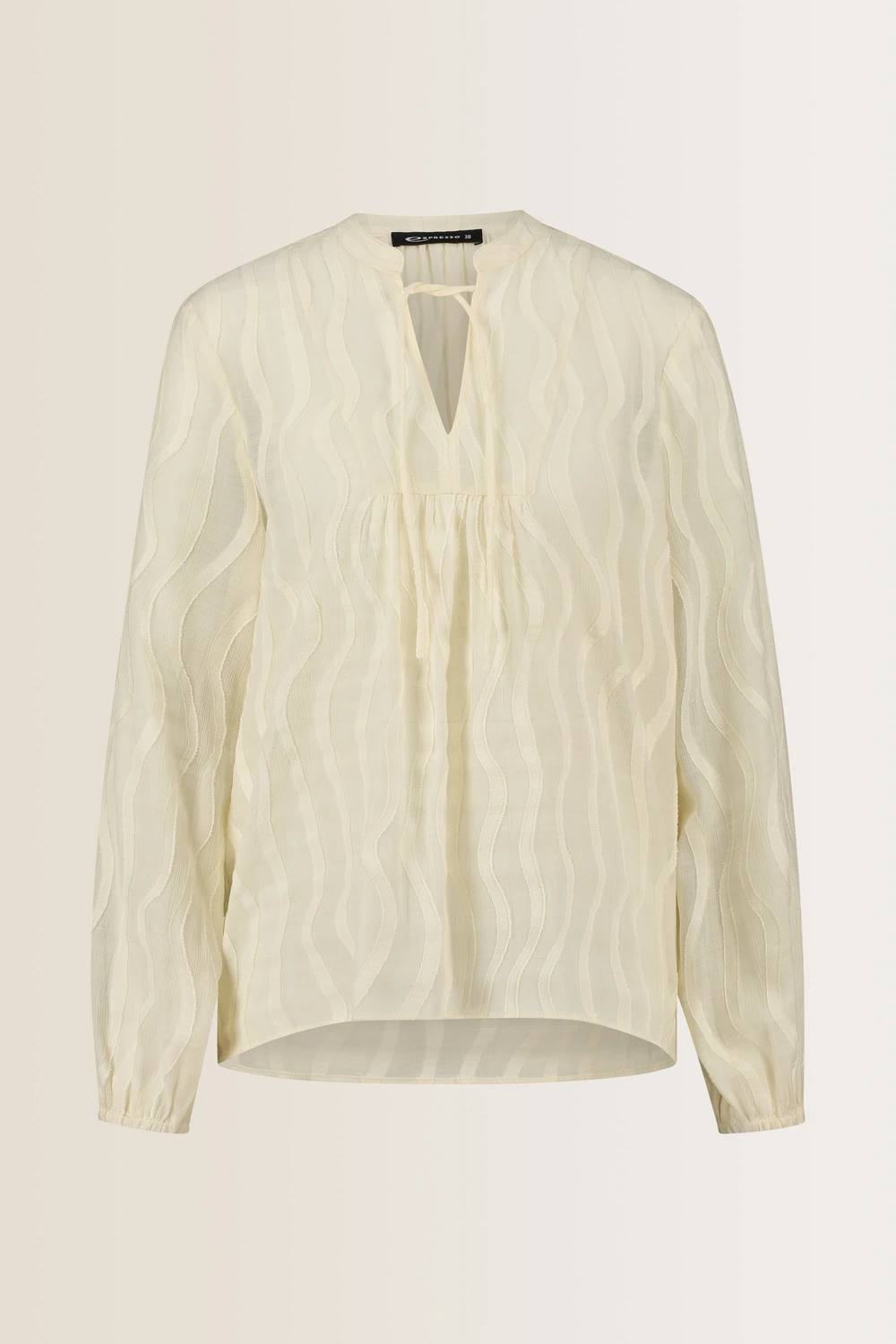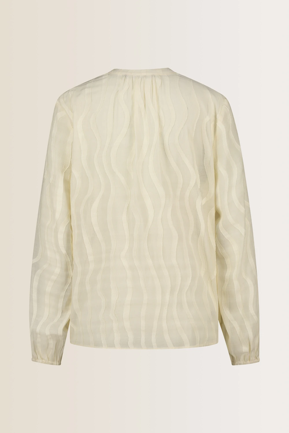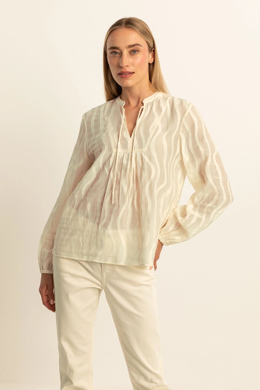 Offwhite blousetop - viscosemix. Recht & relaxed, splithals met striklint, bloezende lange mouwen. Soepele stof, semi-transparant 'ausbrenner' dessin. Offwhite houdt je najaarslooks fris en licht.