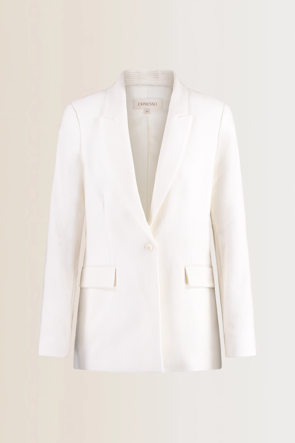 Witte blazer – bouclé met een zachte structuur voor een luxe, verfijnde look. Semi-fitted en licht getailleerd, met een klassieke reverskraag en een enkele knoopsluiting. De klepzakken geven een clean detail, terwijl de voering zorgt dat de blazer mooi valt en comfortabel draagt.