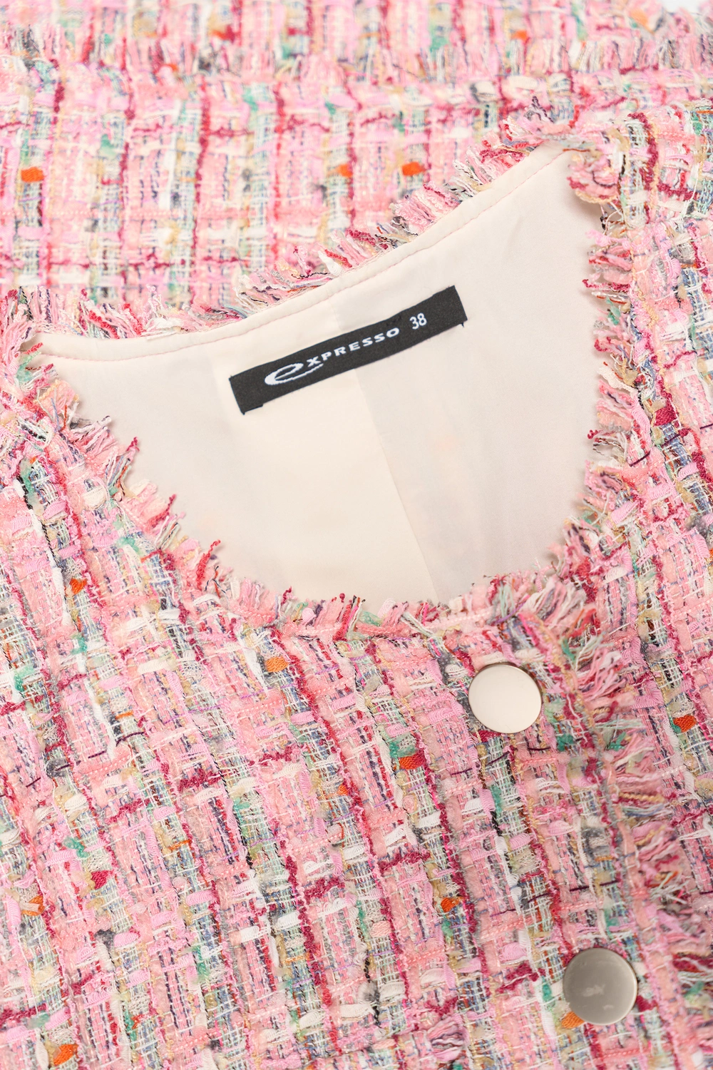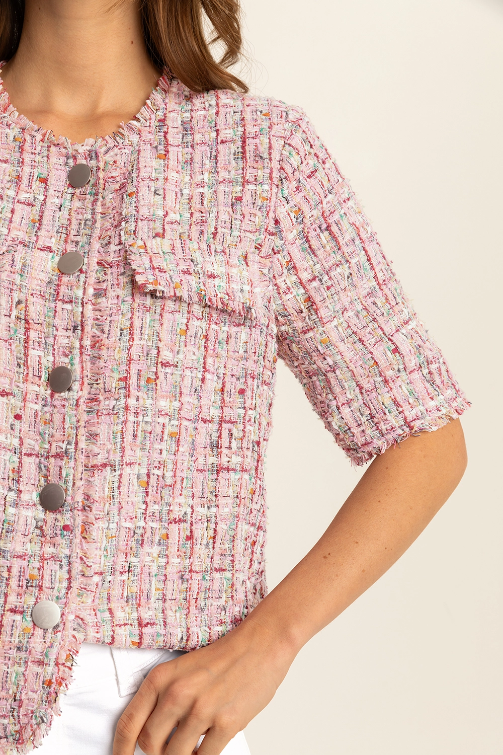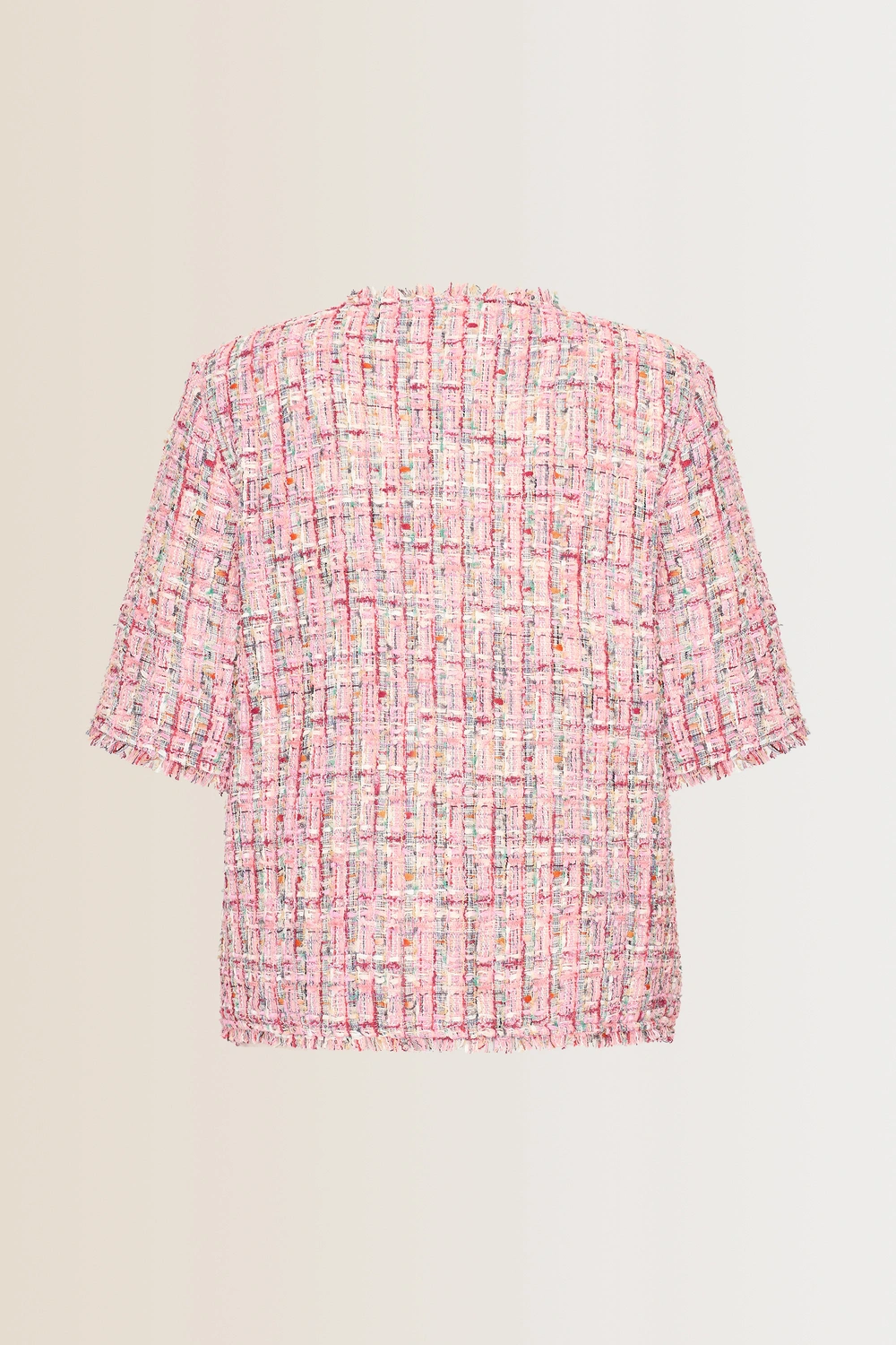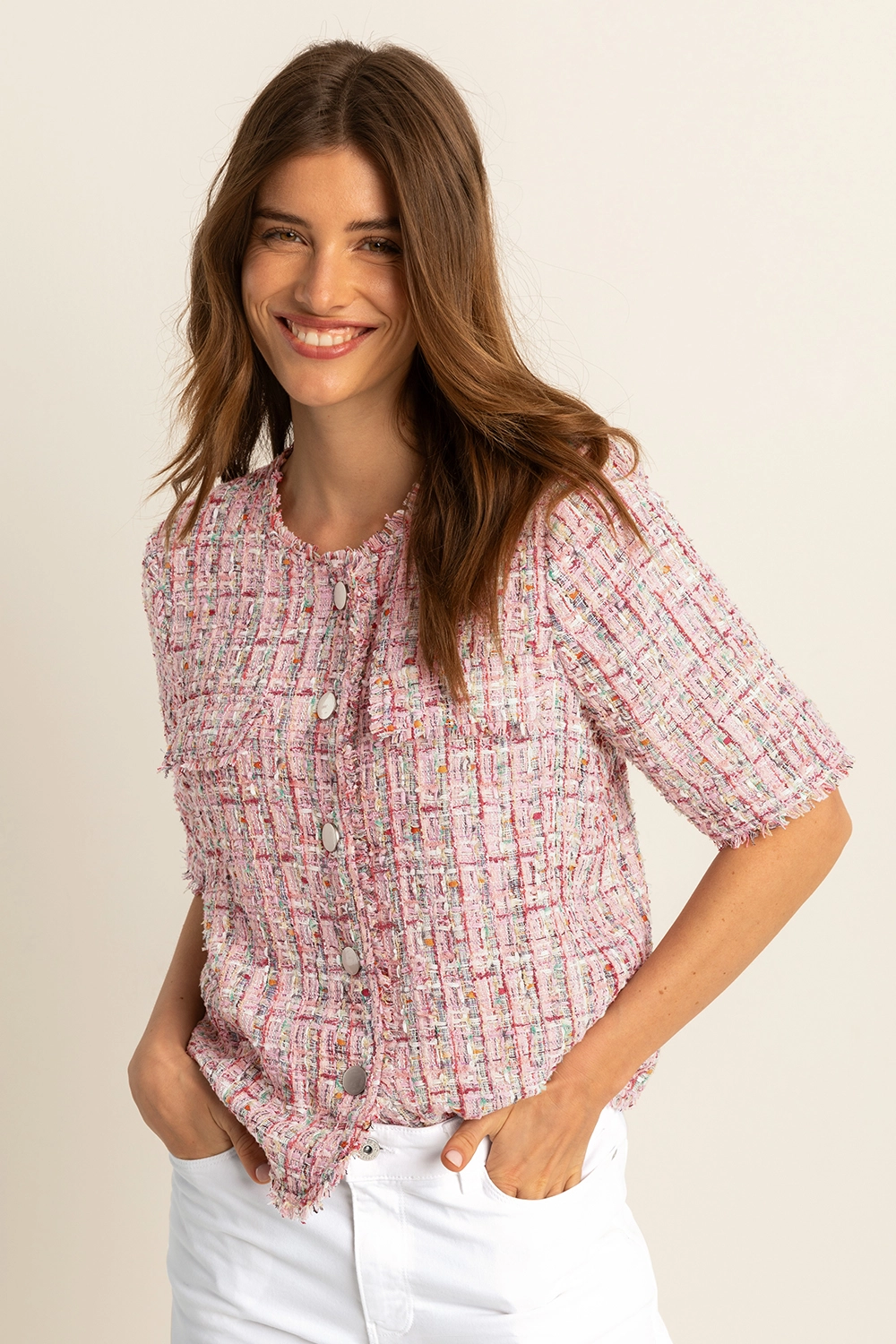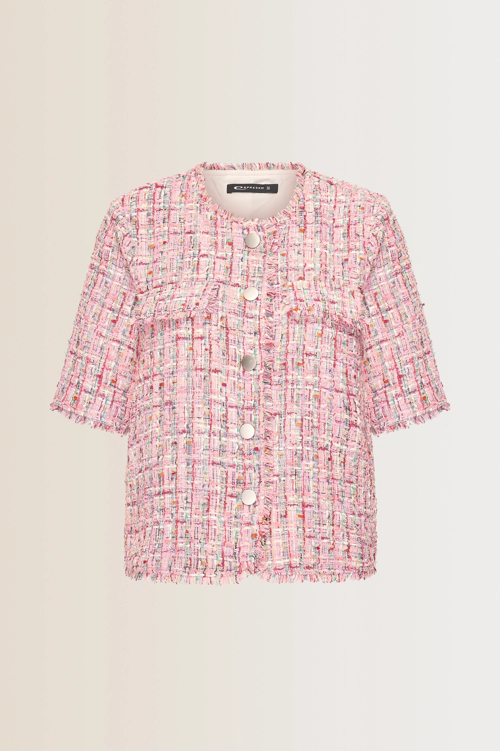Bouclé jasje – Meerkleurige boucléstructuur. Dit jasje biedt een verfijnde uitstraling met een moderne twist, dankzij de zachte, lichtgewicht stof die ideaal is voor de overgangsseizoenen. Het relaxed silhouet met een knoopsluiting zorgt voor een mooie pasvorm en een elegante look. Draag dit bouclé jasje met een geklede broek voor een chique werkoutfit of met een casual jeans voor een ontspannen look.