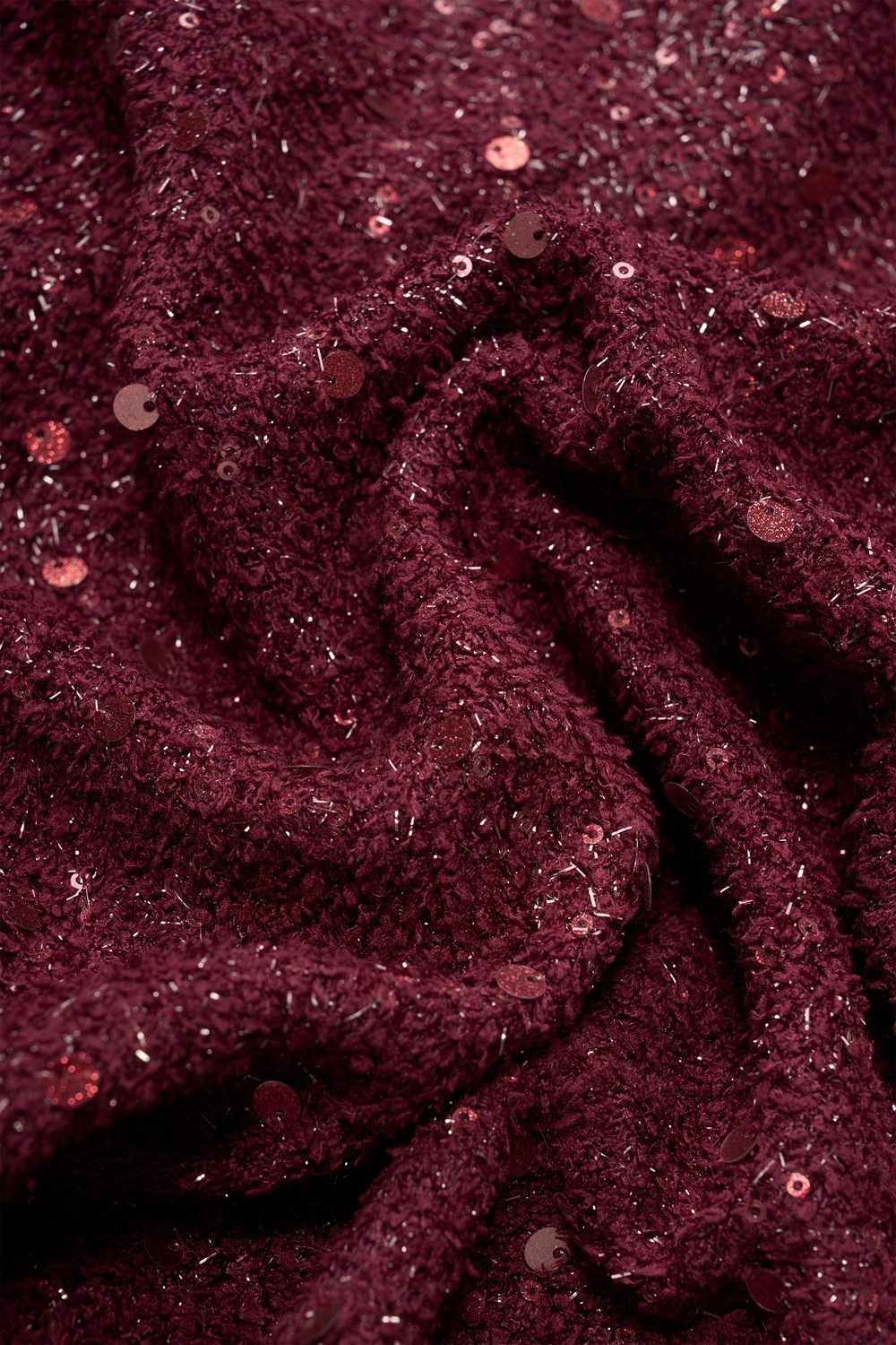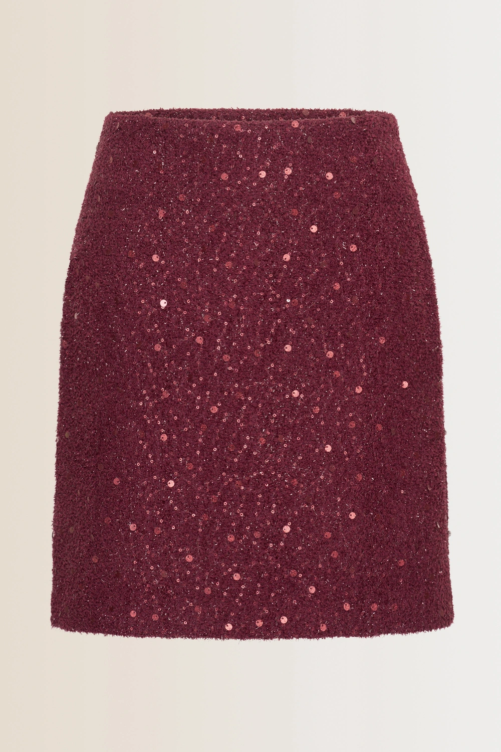 Bordeauxrode mini-rok – bouclé met pailletten. Deze feestelijke rok heeft een rechte pasvorm en is voorzien van glinsterende pailletten all-over. De zachte boucléstof zorgt voor comfort en structuur. Perfect te combineren met een satijnen blouse of het bijpassende bouclé jasje voor een gecoördineerde partylook.