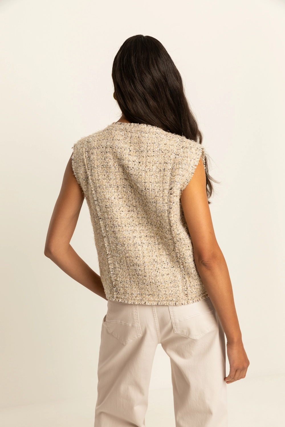 Zandkleurige gilet – luxe bouclékwaliteit met een rijke, geweven structuur. Dit mouwloze gilet heeft een rechte, vrouwelijke pasvorm en is afgewerkt met een ronde hals en een knoopsluiting. De verfijnde bouclé en subtiele kleurnuances geven het item een elegante, eigentijdse uitstraling. Perfect om te dragen over een blouse of top, maar ook stijlvol als set met de bijpassende items voor een moderne, gelaagde look.