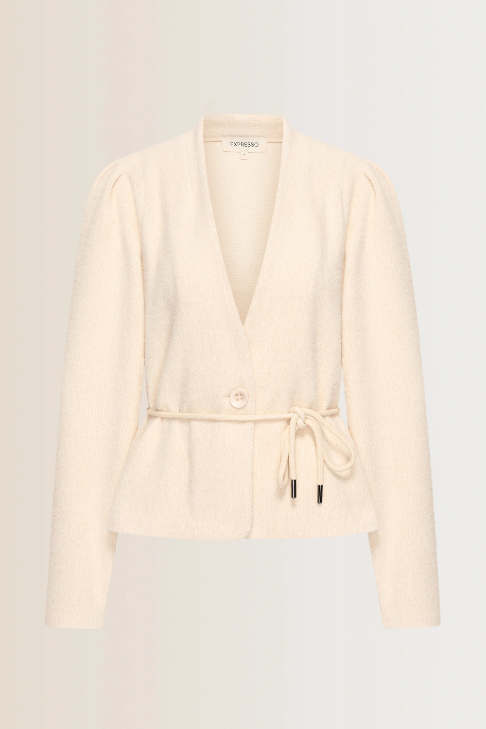 Ecru vest – zachte bouclémix met een verfijnde structuur. Semi-fitted model met diepe V-hals, één knoopsluiting en een afneembaar strikkoord in de taille. De licht gepofte schouders en vrouwelijke belijning geven dit vest een elegante uitstraling, terwijl het materiaal heerlijk zacht aanvoelt. Perfect om zowel casual als stijlvol te dragen – combineer met een printbroek of draag over een jurk voor een gelaagde look.