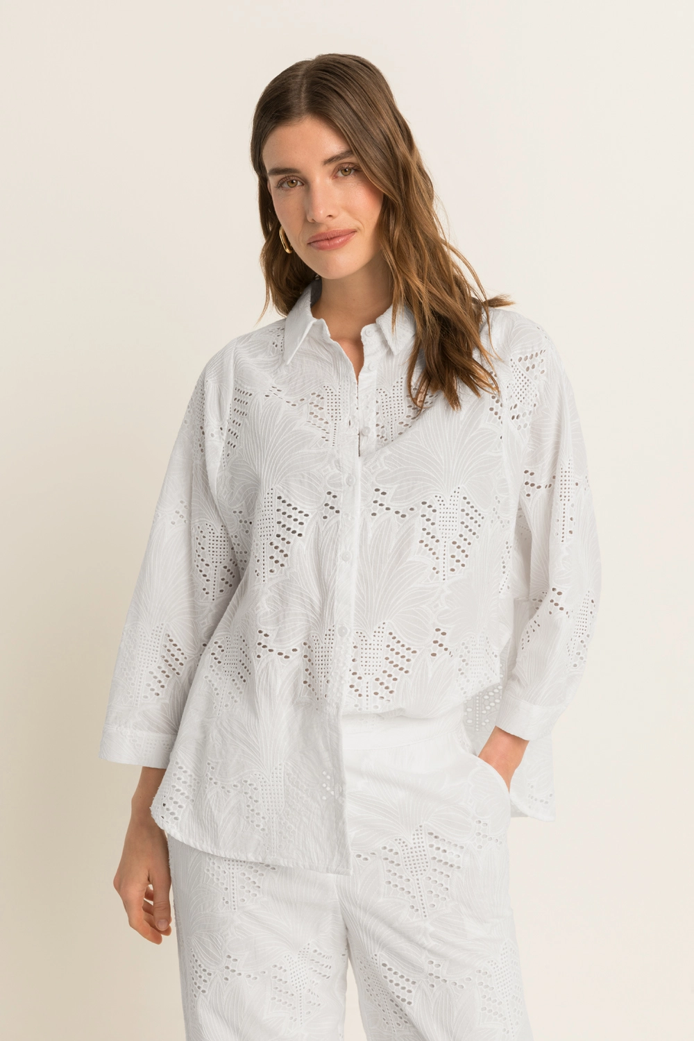 Witte blouse met broderie – luchtige katoenkwaliteit met een rijk geborduurd dessin en opengewerkte details. Losvallend en vrouwelijk, met een klassieke kraag, knoopsluiting en driekwartsmouwen. De verfijnde broderie geeft deze blouse een elegante, zomerse uitstraling. Een bijzonder item dat je look direct licht, stijlvol en verzorgd maakt.