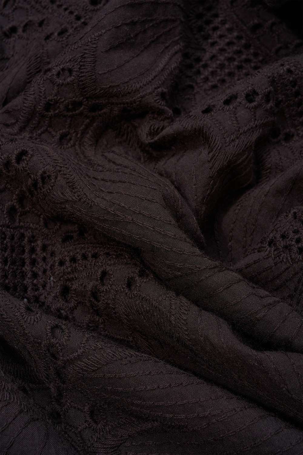 Zwarte blouse met broderie – luchtige katoenkwaliteit met een rijk geborduurd dessin en opengewerkte details. Losvallend en vrouwelijk, met een klassieke kraag, knoopsluiting en driekwartsmouwen. De verfijnde broderie geeft deze blouse een elegante, zomerse uitstraling. Een bijzonder item dat je look direct licht, stijlvol en verzorgd maakt.