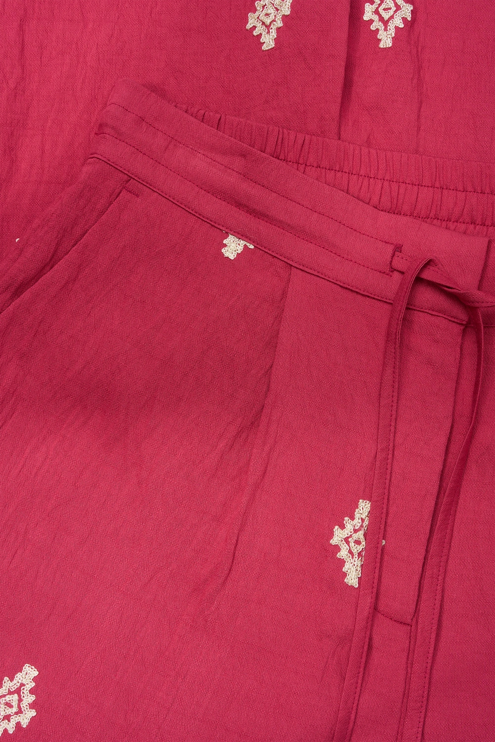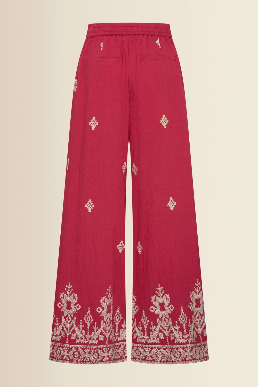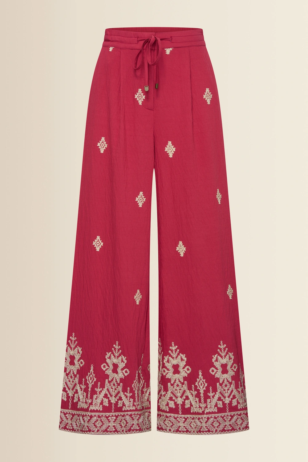 Rode broek met borduursel – luchtige, soepelvallende kwaliteit met een rijke uitstraling. Hoog in de taille en elegant vallend, met een elastische tailleband, strikceintuur en extra wijde pijpen. Het verfijnde borduurwerk langs de zoom geeft deze broek een opvallend en vrouwelijk karakter, terwijl de lichte stof comfortabel draagt en mooi meebeweegt.
