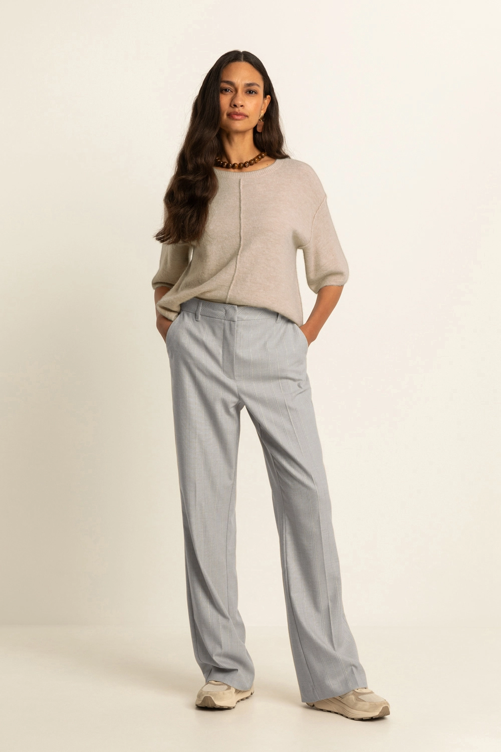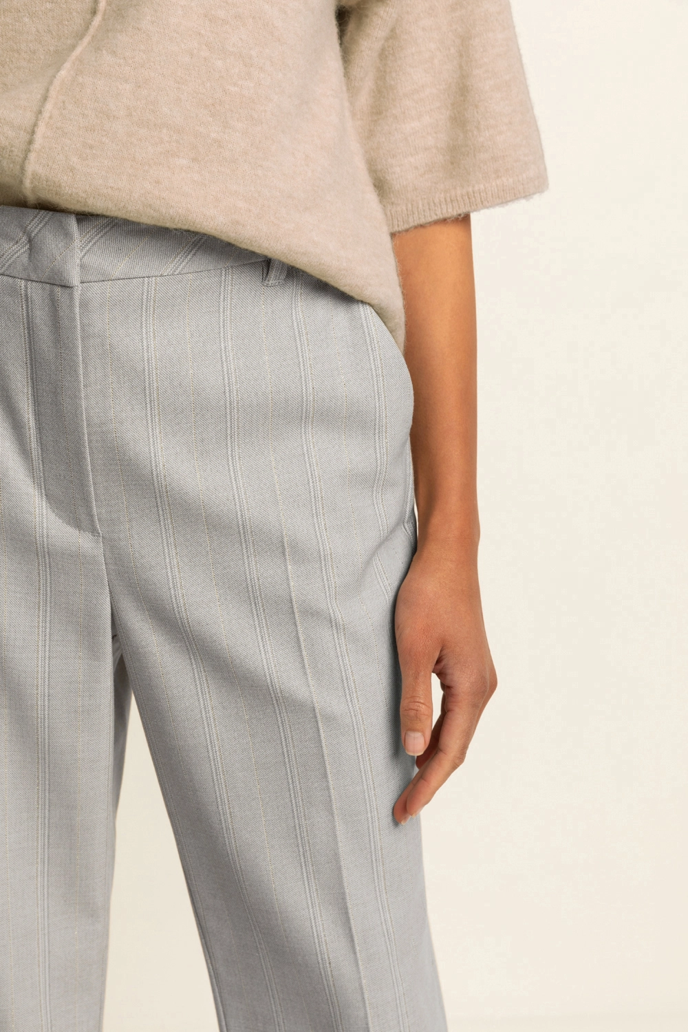 Pantalon met krijtstreep – elegante pantalon met een verfijnde, licht uitlopende pijp en een krachtige uitstraling. De subtiele krijtstreep geeft dit item een moderne, zakelijke touch, terwijl de hoge taille en mooie belijning zorgen voor een vrouwelijk silhouet. De stof valt soepel en blijft mooi in vorm, ideaal voor lange dagen waarop stijl en comfort samenkomen. Een tijdloze klassieker met een eigentijdse twist.