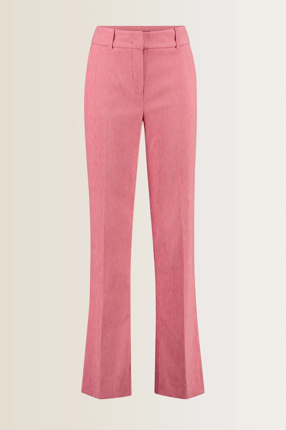 Roze broek – stretch corduroy. Relaxte pasvorm, hogere taille, rechte wijde pijpen. Zachte stretchkwaliteit, smalle ribstructuur. Een must voor het najaar: ribfluweel in de nieuwste seizoenstinten. Tip: style met de bijpassende blazer als smart-casual office outfit.
