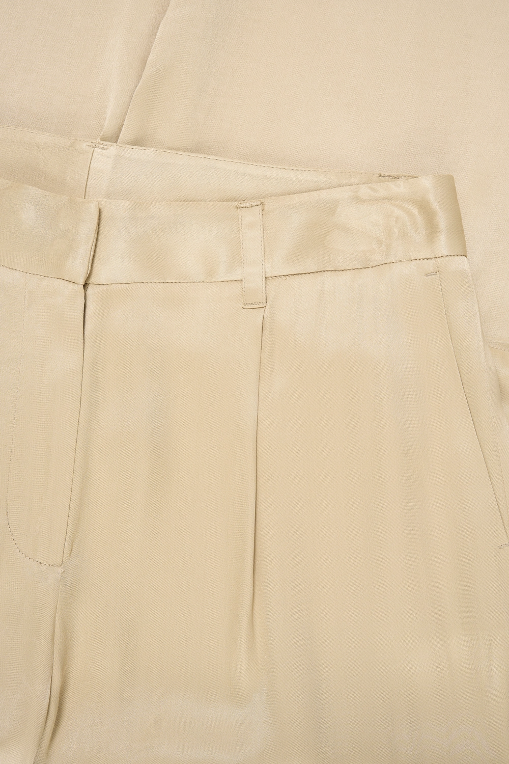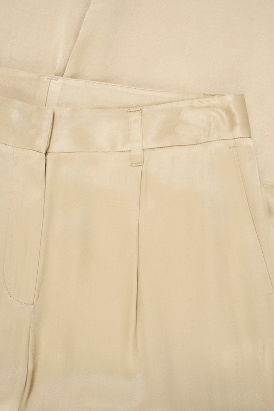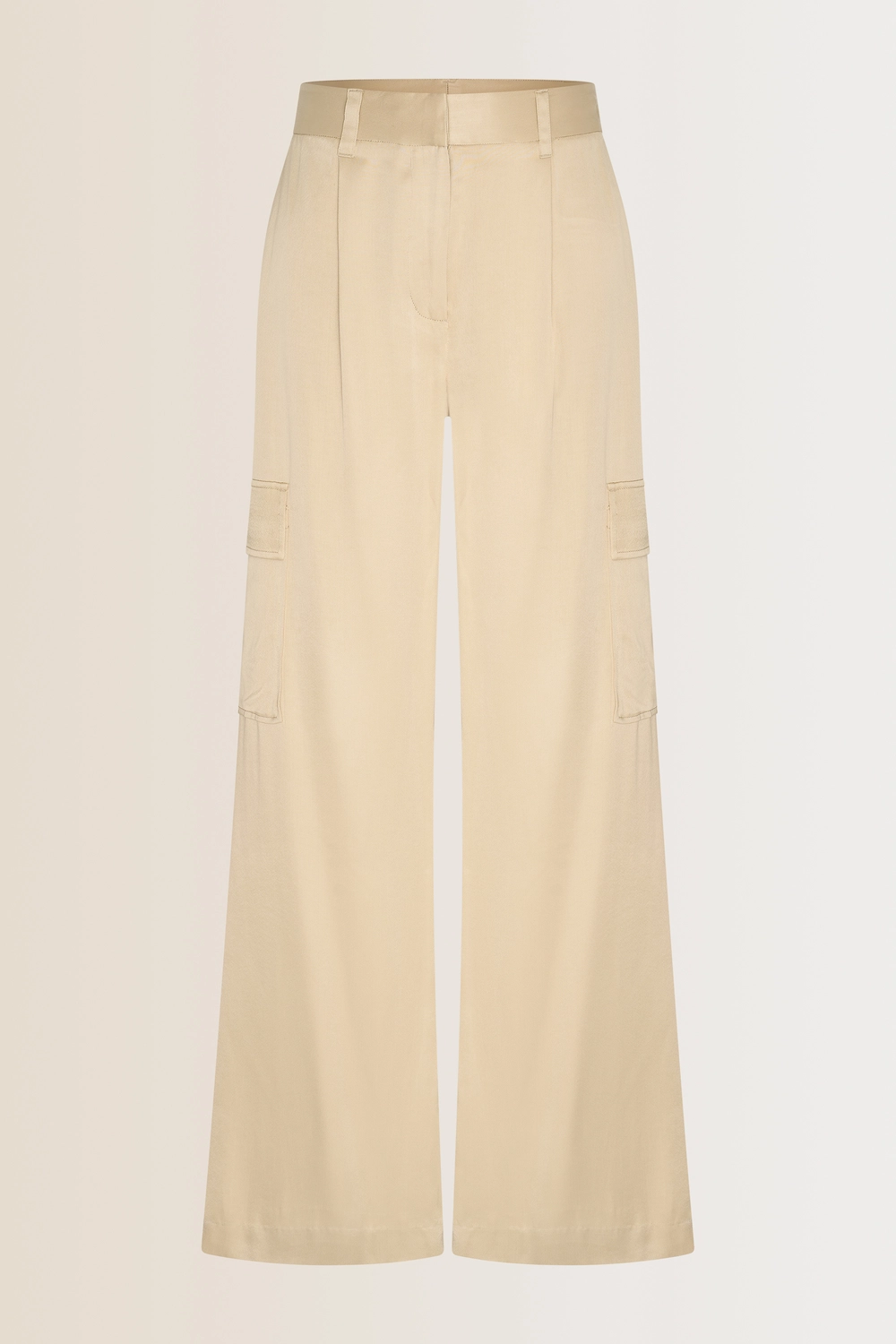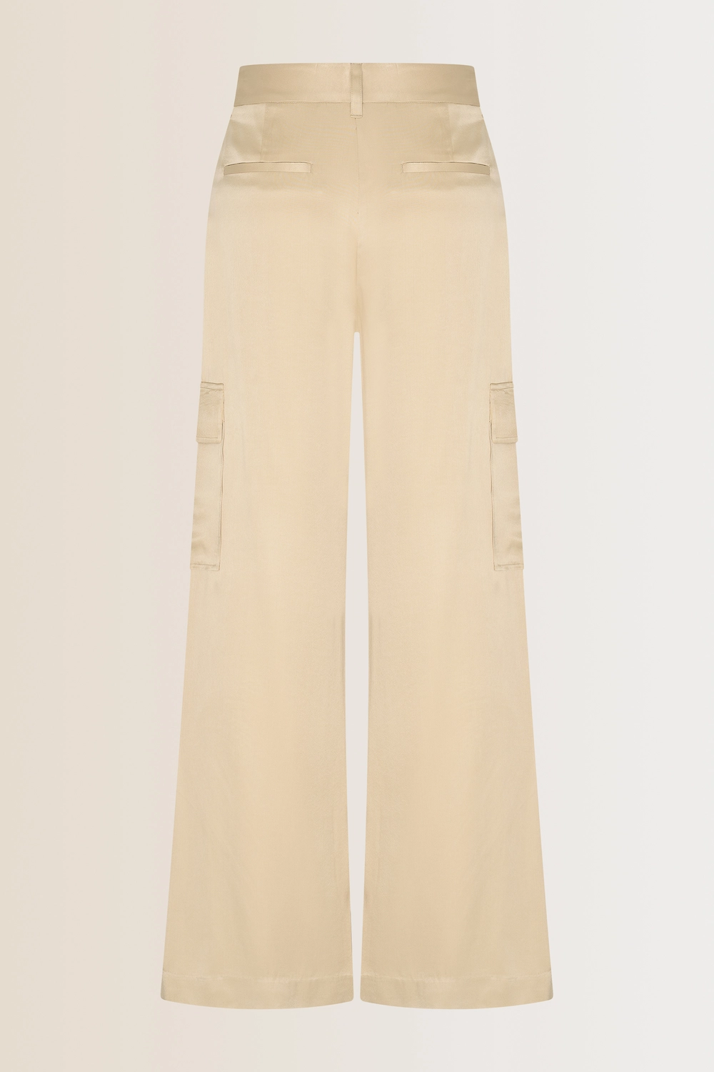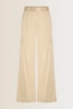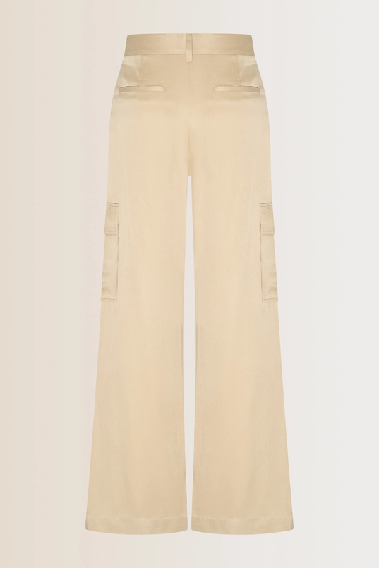Beige cargobroek – soepelvallende stof met een subtiele glans. Losvallend model, hoge taille, wijde pijpen. De cargozakken geven een stoere touch aan deze vrouwelijke broek, terwijl de soepele stof zorgt voor een moeiteloze en flatterende pasvorm. Combineer met een aansluitende top en hakken voor een chique look of draag met een oversized blazer voor een moderne twist.