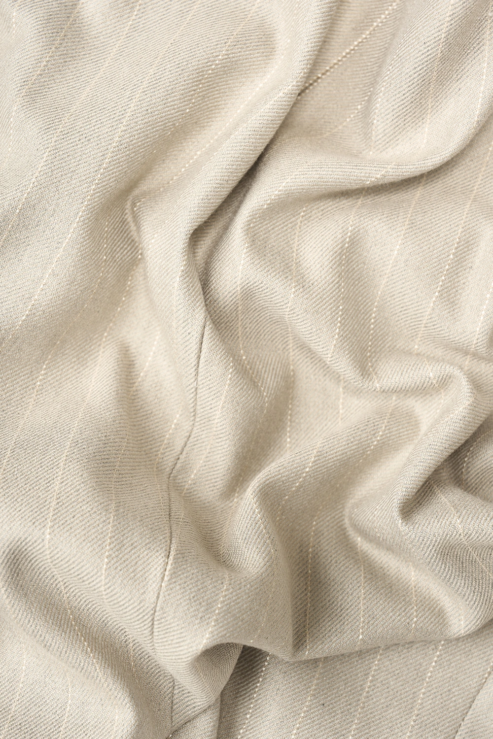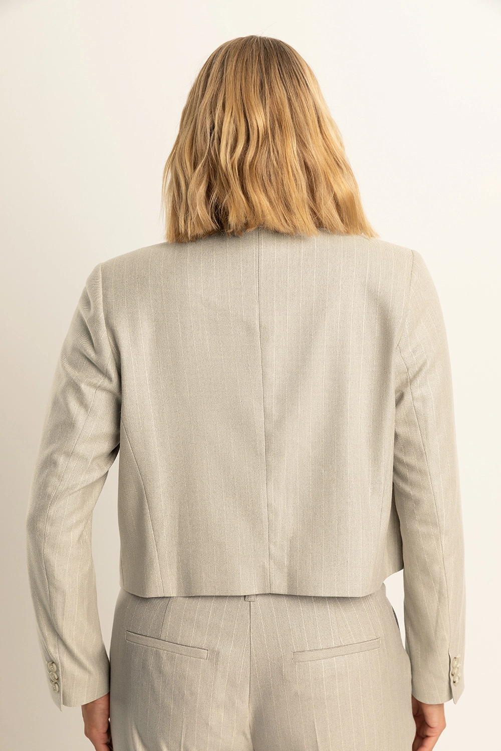 Beige cropped blazer – viscoseblend met fijne krijtstreep. Stijlvol en modern, met klassieke reverskraag, eenknoopssluiting en een vrouwelijke cropped lengte. Deze blazer heeft een subtiele glans en is perfect voor een smart casual look. Combineer met een bijpassende broek of rok voor een power suit effect, of draag losjes over een jurk.