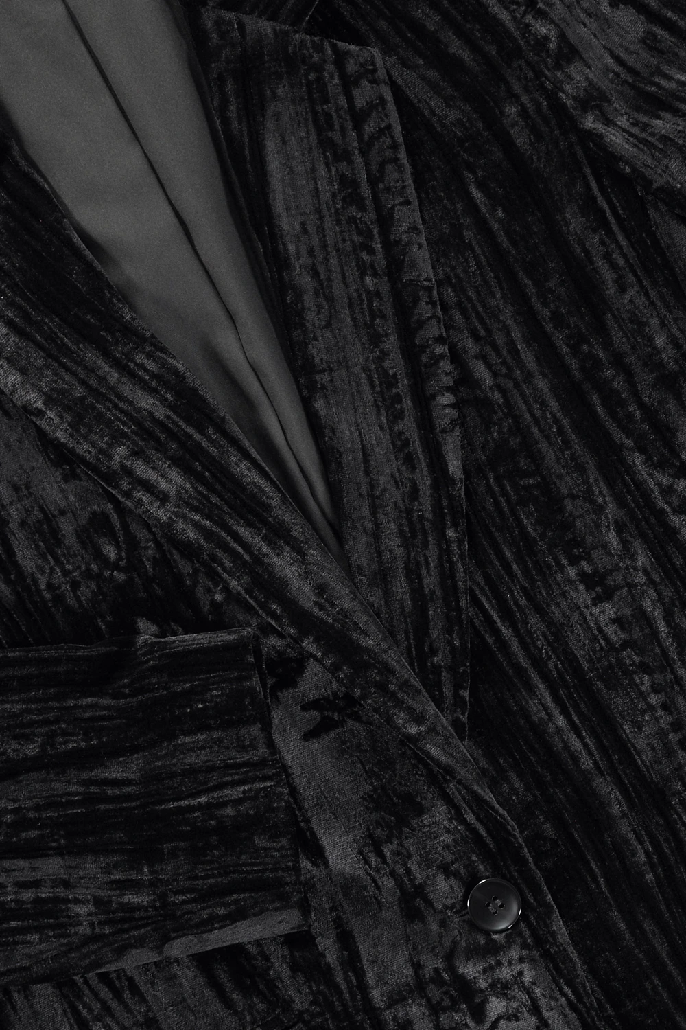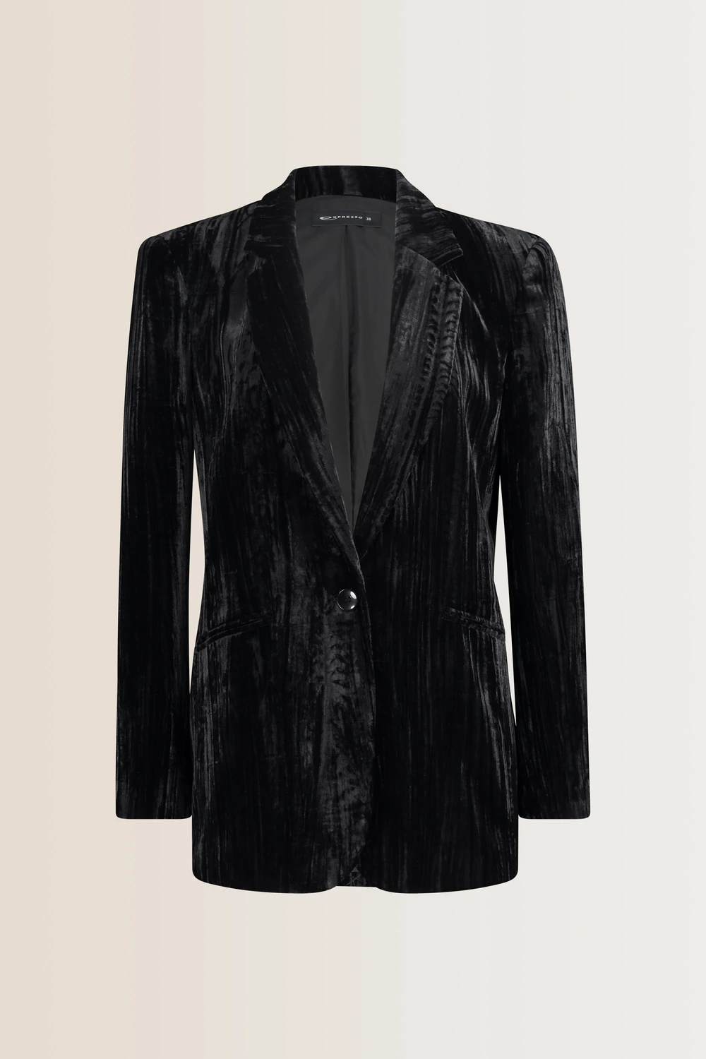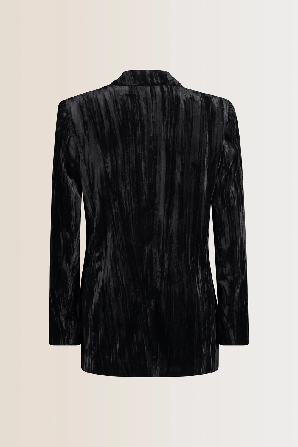 Zwarte blazer in crushed velvet – polyesterblend. Enkel knoopsluiting, getailleerde pasvorm, lengte tot over de heup. Luxe velvet textuur, licht glanzend voor een chique uitstraling. De perfecte blazer voor feestelijke gelegenheden of een stijlvolle avondlook.