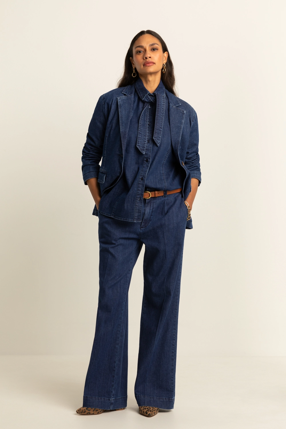 Donkerblauwe denim blazer – comfortabele stretchdenim met een cleane wassing. Licht getailleerd en vrouwelijk gesneden, met een klassieke reverskraag en een single-breasted knoopsluiting. De denim kwaliteit geeft deze blazer een moderne, eigentijdse uitstraling, terwijl de verfijnde belijning zorgt voor een verzorgde look. Ideaal om te dragen naar kantoor, maar net zo stijlvol in het weekend.