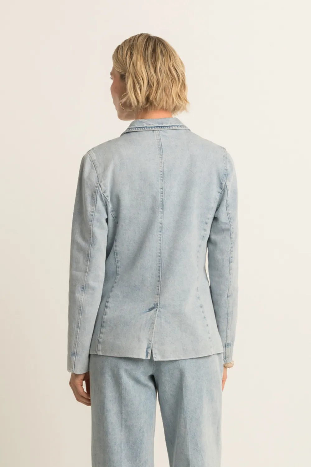 Lichtblauwe denim blazer – katoenkwaliteit met een authentieke denimlook. Semi-fitted en vrouwelijk gevormd, met een reverskraag, éénknoopsluiting en klepzakken. De frisse wassing geeft deze blazer een moderne, casual uitstraling, terwijl de soepele denim zorgt voor een comfortabele fit die makkelijk draagt. Een stijlvol jasje dat moeiteloos combineert met zowel een jurk als een broek voor een verzorgde denim look.