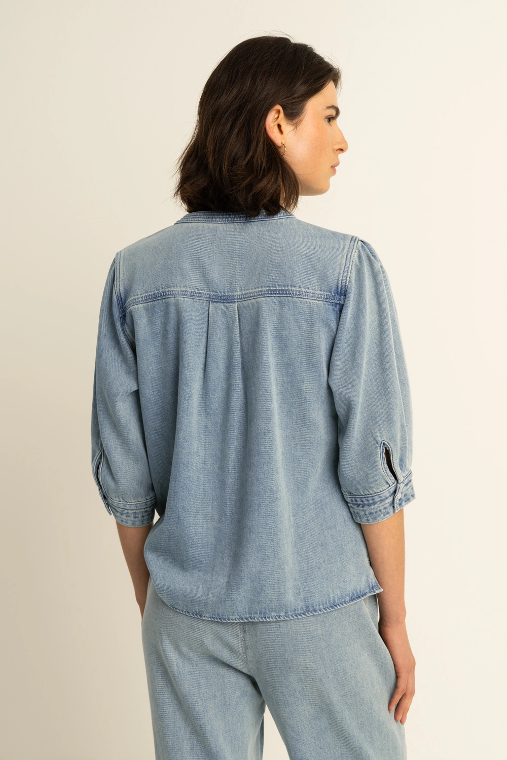 Blauwe denim blouse – een eigentijdse klassieker met een vrouwelijke twist. Deze blouse is uitgevoerd in soepel denim met een zachte wassing en voelt comfortabel aan. De ronde hals met knoopsluiting geeft een verfijnde uitstraling, terwijl de licht gepofte mouwen zorgen voor een subtiel statement. De rechte fit maakt dit item makkelijk te combineren, van casual tot meer gekleed.