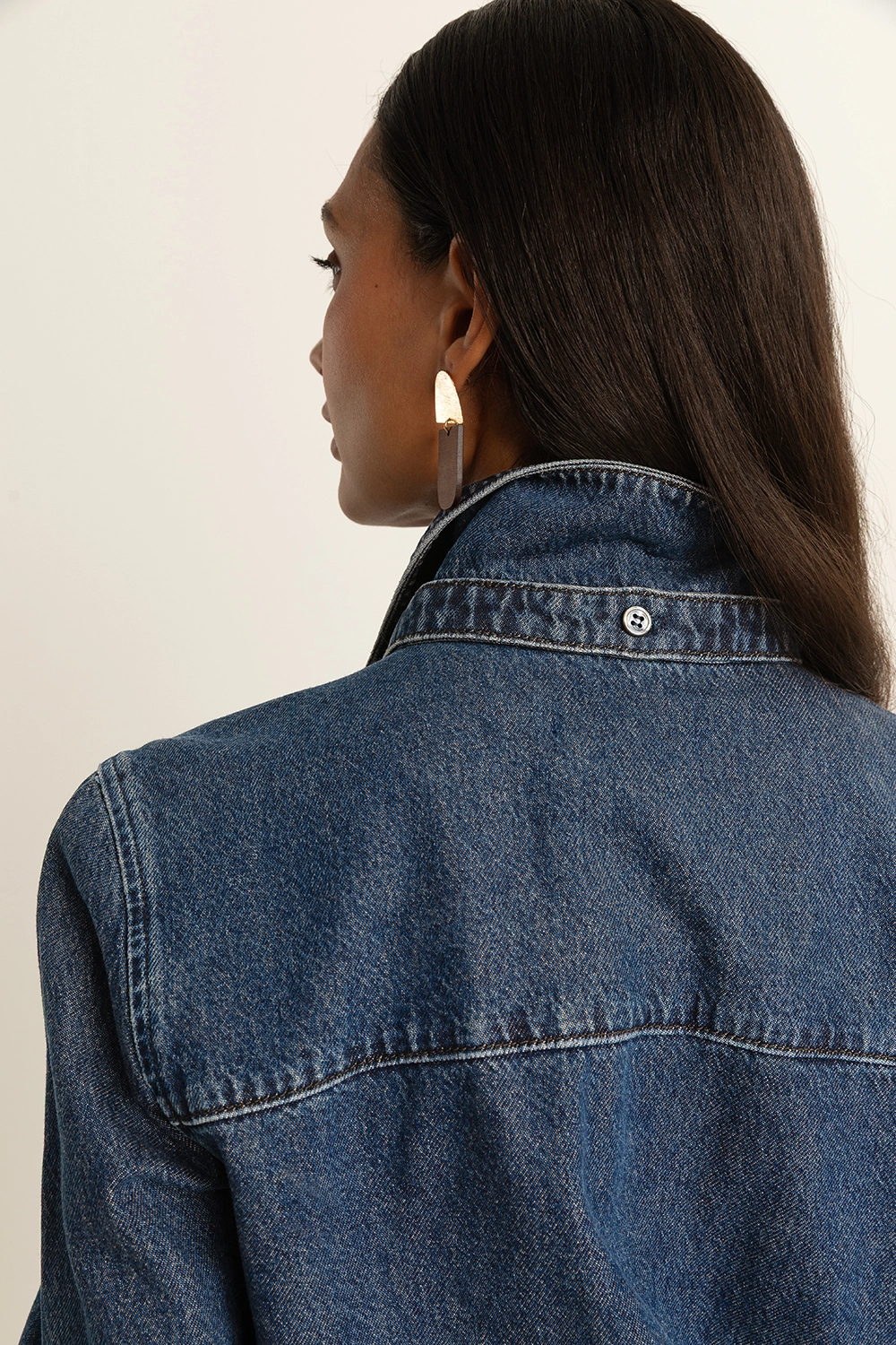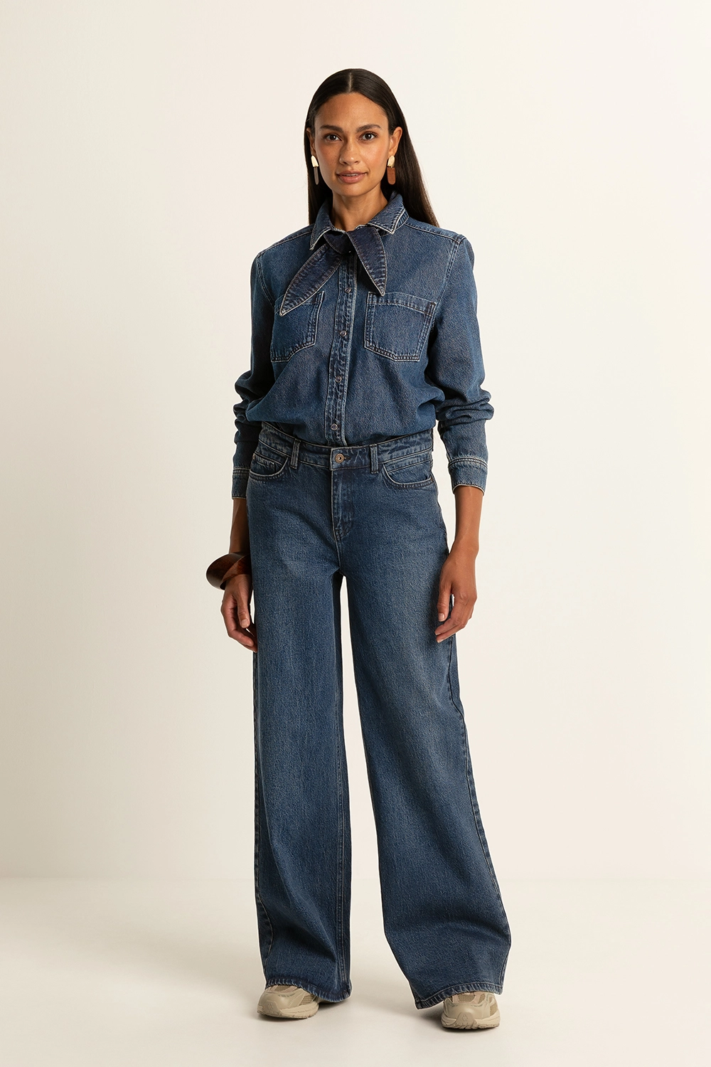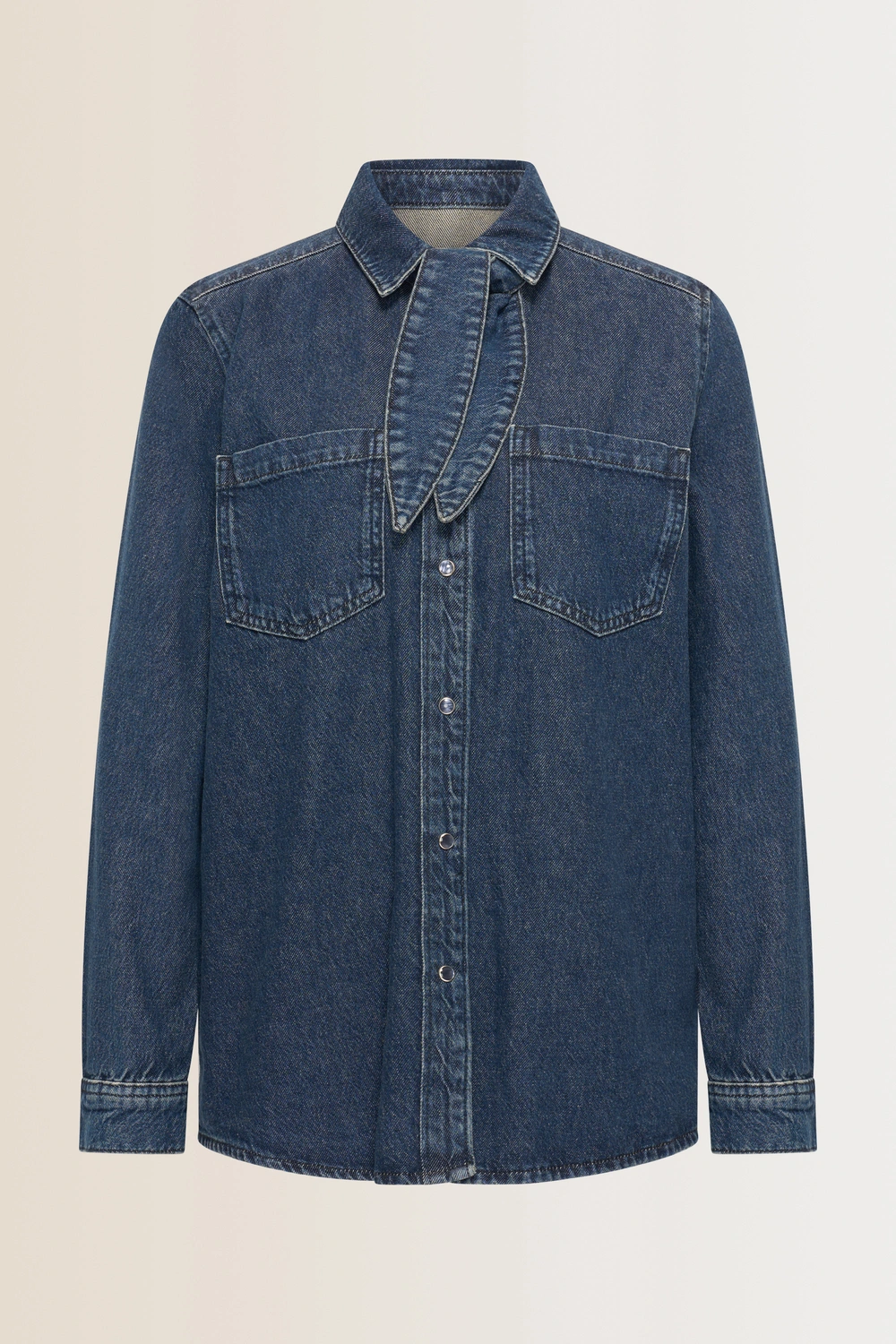 Donkerblauwe denim blouse – katoen in een stevige maar soepele kwaliteit. Rechtvallend model met lange mouwen, drukknoopsluiting en borstzakken. De blouse heeft een afneembare strik bij de hals, wat zorgt voor een speelse twist en een veelzijdige stylingoptie.