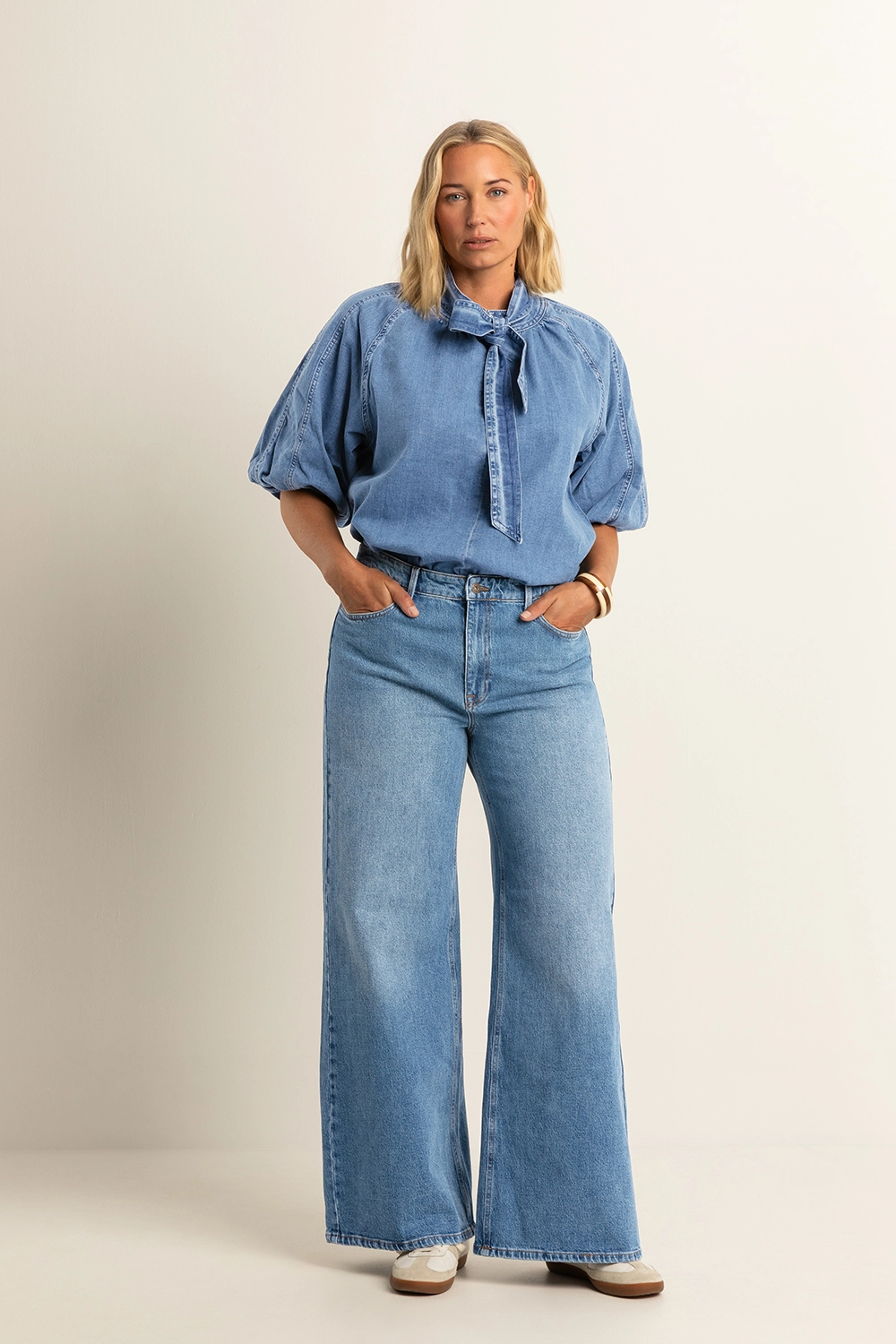 Denim blouse – katoenkwaliteit met lichte stretch. Relaxed fit met pofmouwen, een smalle opstaande kraag en afneembaar strikdetail. De katoenen kwaliteit en vrouwelijk silhouet maken dit ontwerp geschikt voor elke dag. Draag met een jeans voor een ton-sur-ton look met karakter.