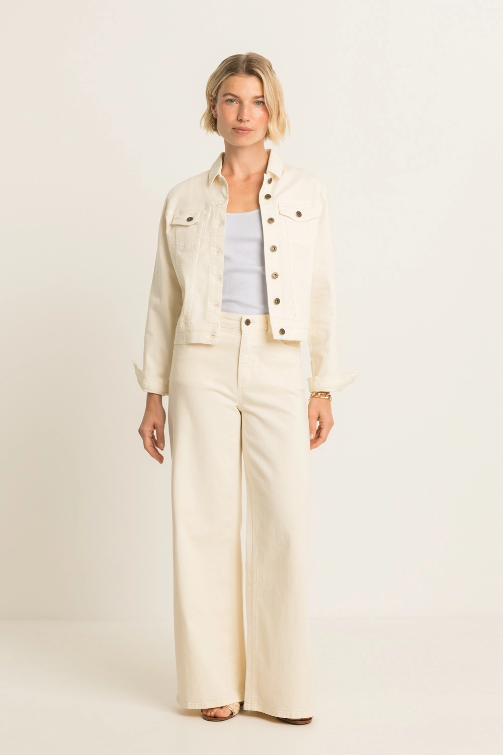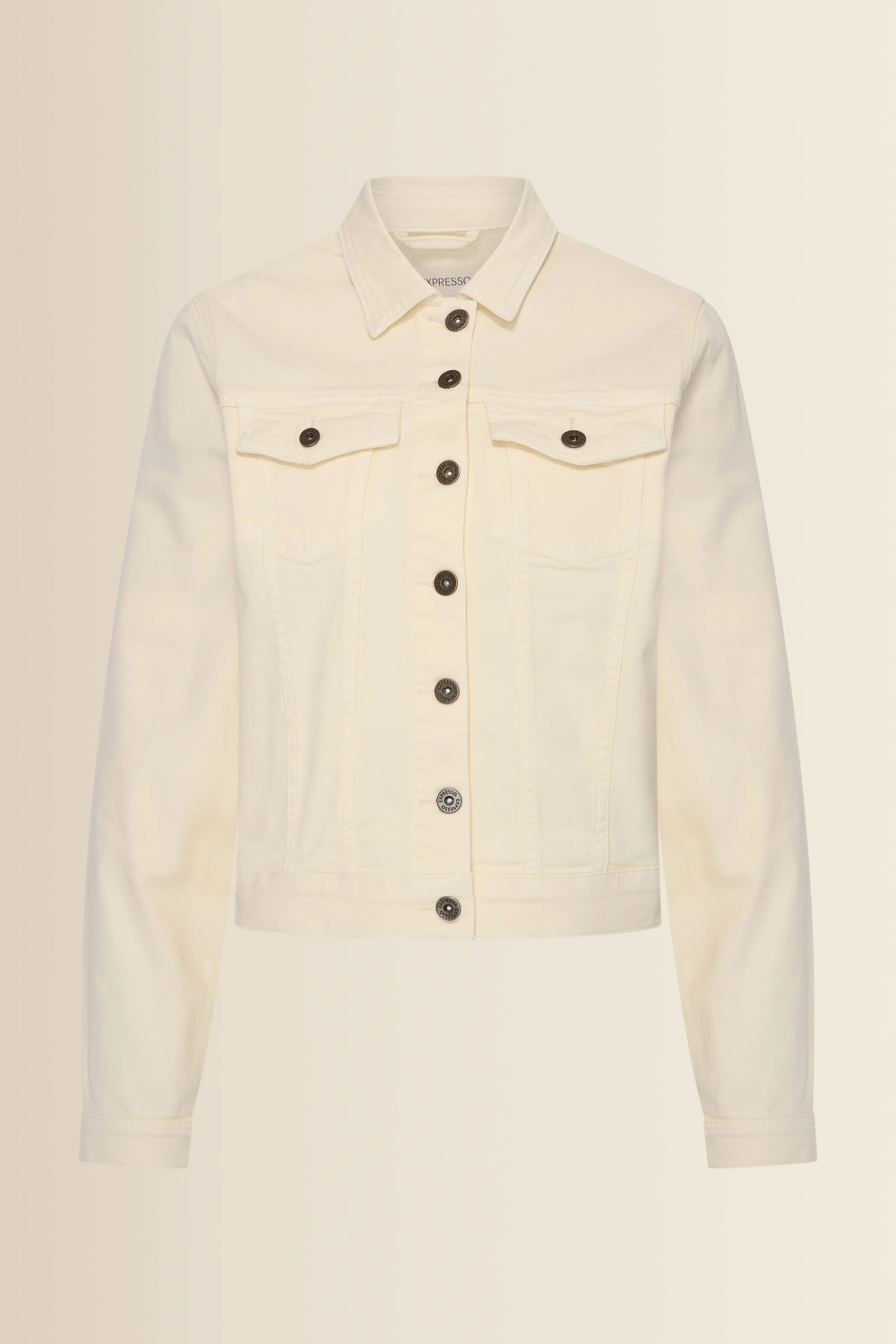 Ecru denim jack – katoenkwaliteit met een comfortabele stretch en een cleane, frisse uitstraling. Semi-fitted en vrouwelijk gevormd, met een klassieke kraag, doorknoopsluiting en klepzakken op de borst. De lichte tint maakt dit jack extra veelzijdig, terwijl de stevige denim mooi in vorm blijft en prettig draagt.