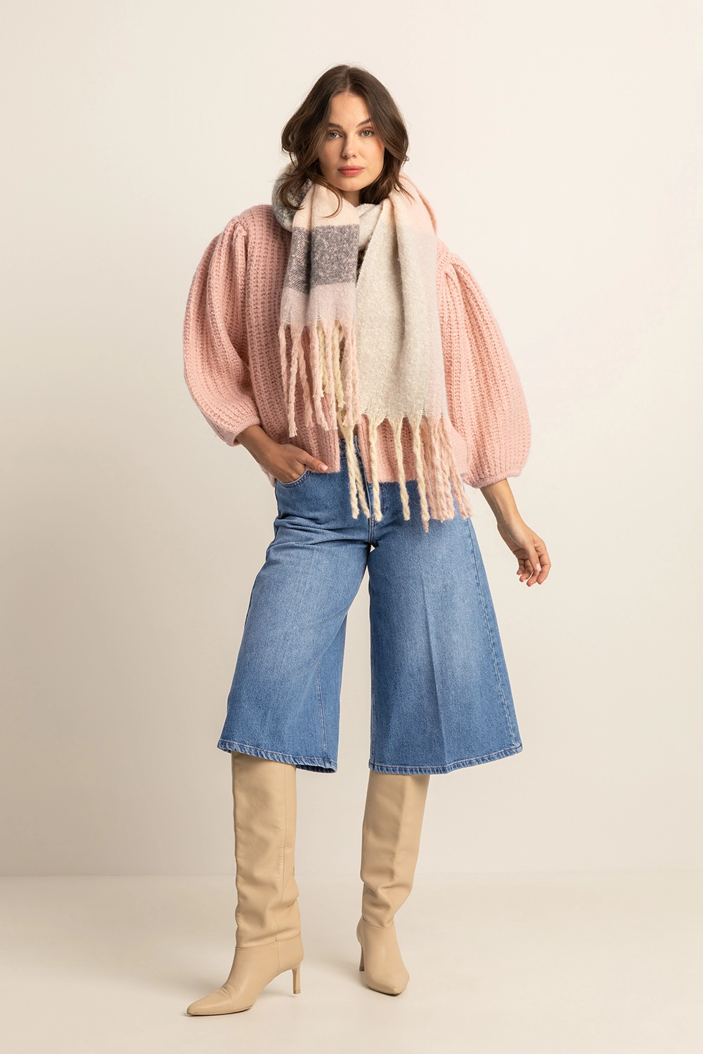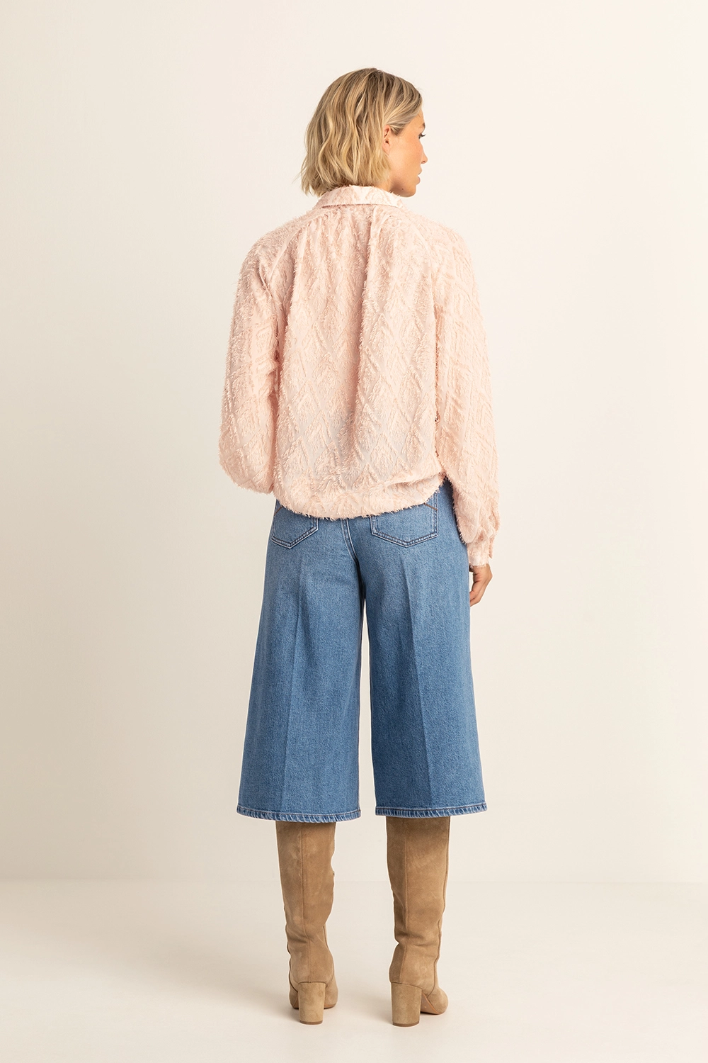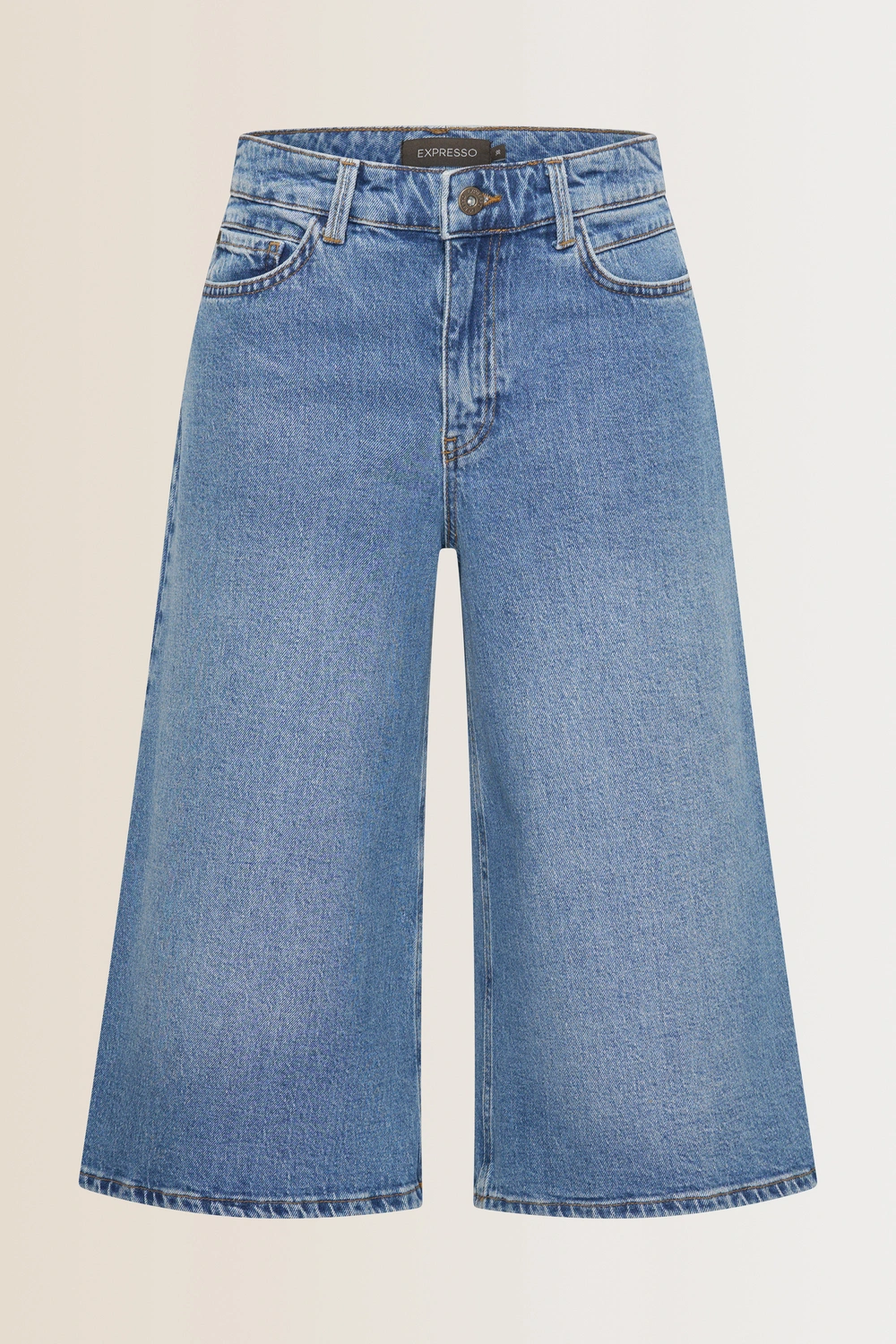 Blauwe culotte – High-waist, wijd uitlopend model tot halverwege de kuit. Het soepele denim en de flatterende A-lijn geven deze culotte een eigentijdse en luchtige look, perfect voor het nieuwe seizoen. Combineer met hoge laarzen en een grofgebreid vest voor een stijlvolle najaarsoutfit, of draag met sneakers voor een relaxte weekendlook.