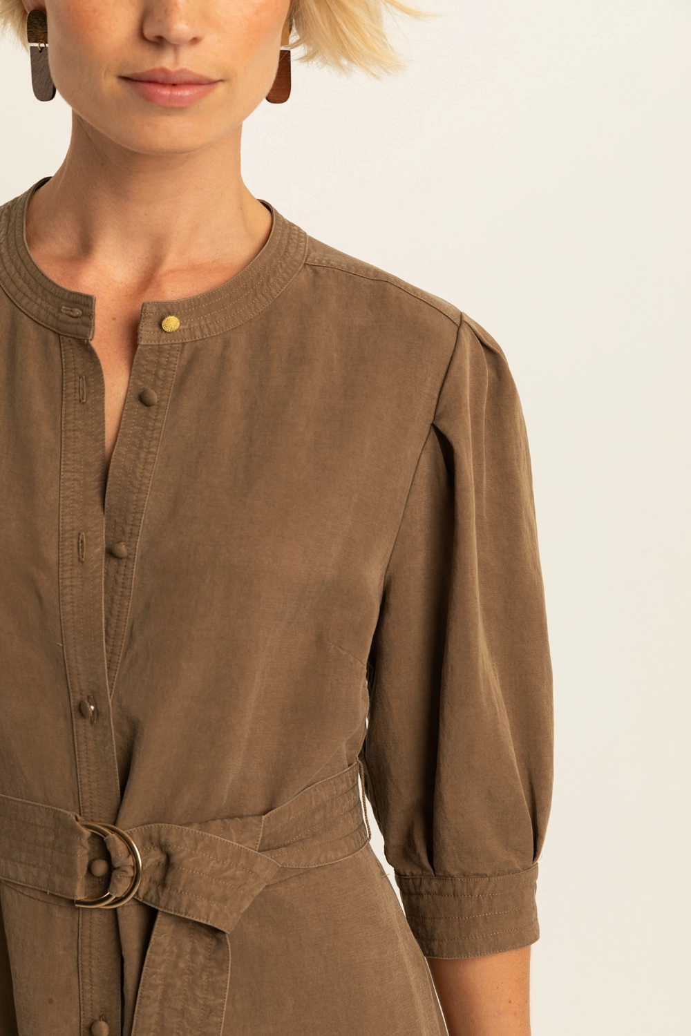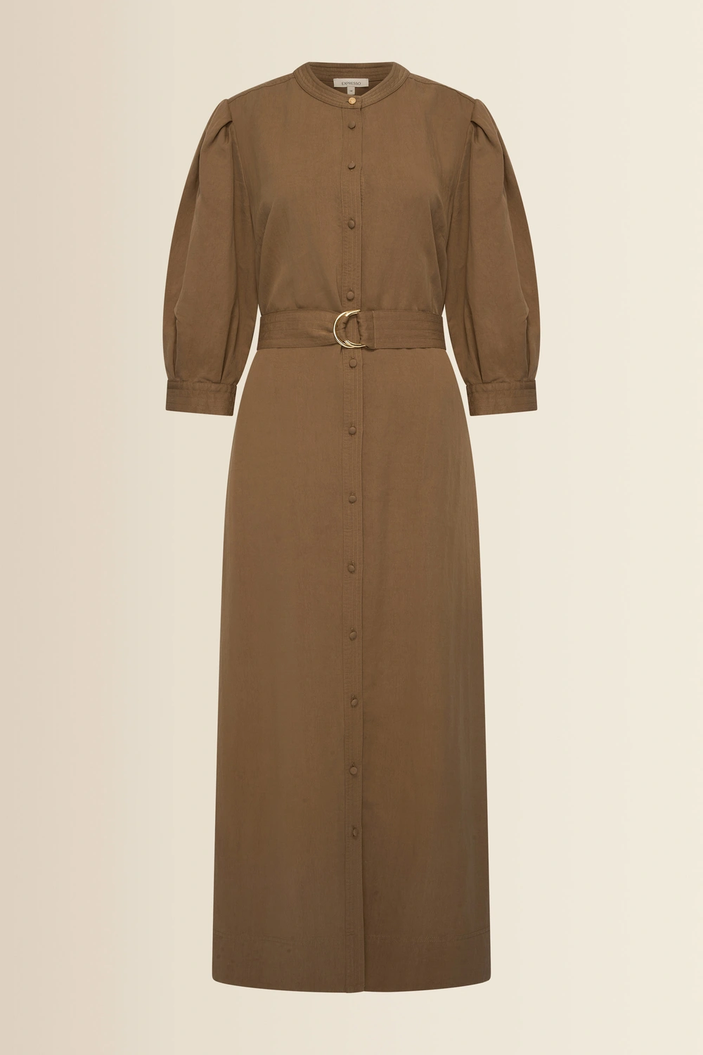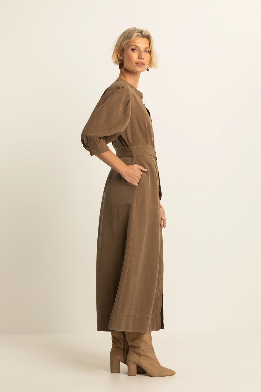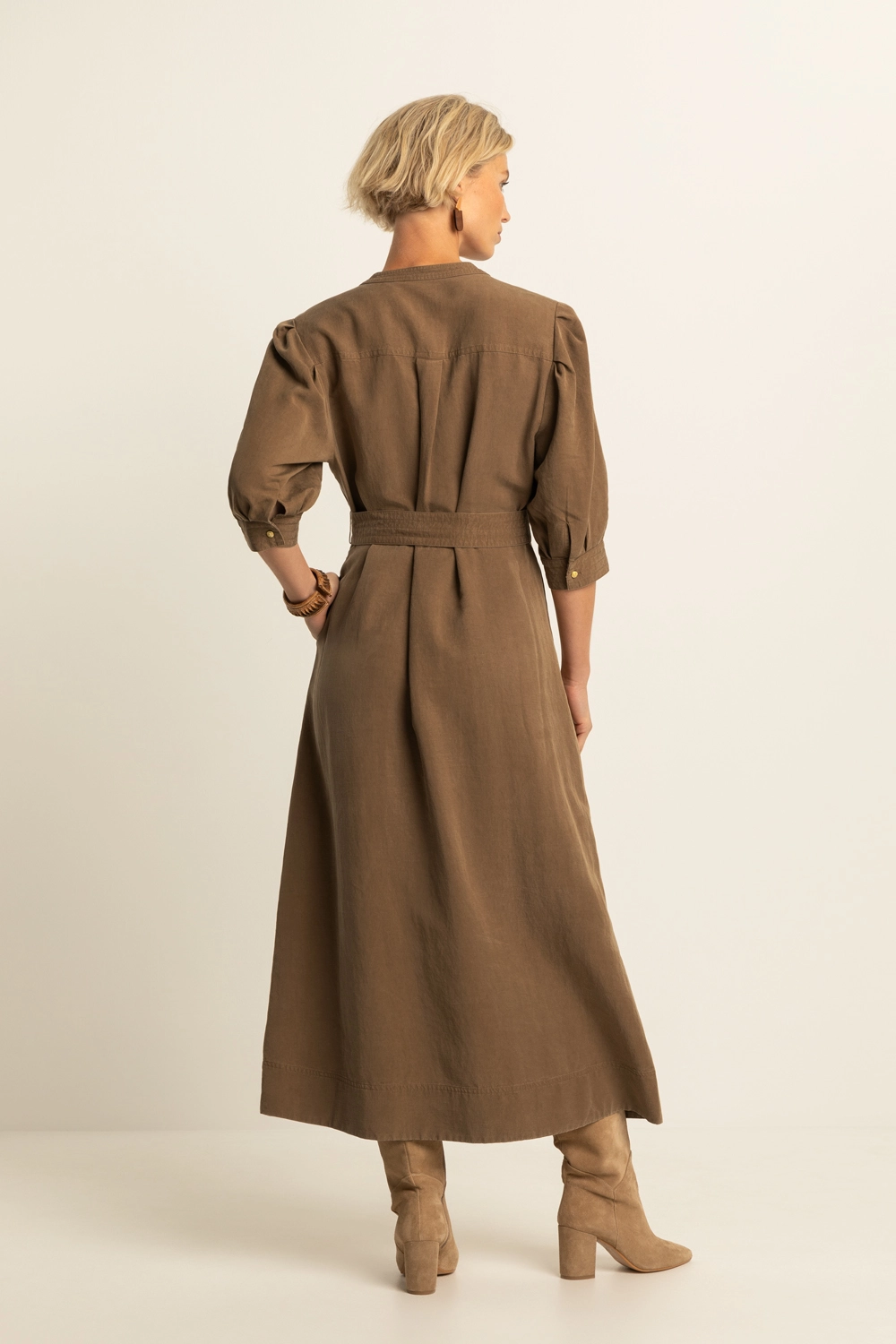 Donkerbruine maxi-jurk – soepele, comfortabele stof met een zachte, matte finish. Vrouwelijk en sterk in één: de licht gepofte schouders, 3/4 mouwen en doorknoopsluiting geven een verfijnde look, terwijl de ceintuur met ringgesp je taille mooi accentueert.