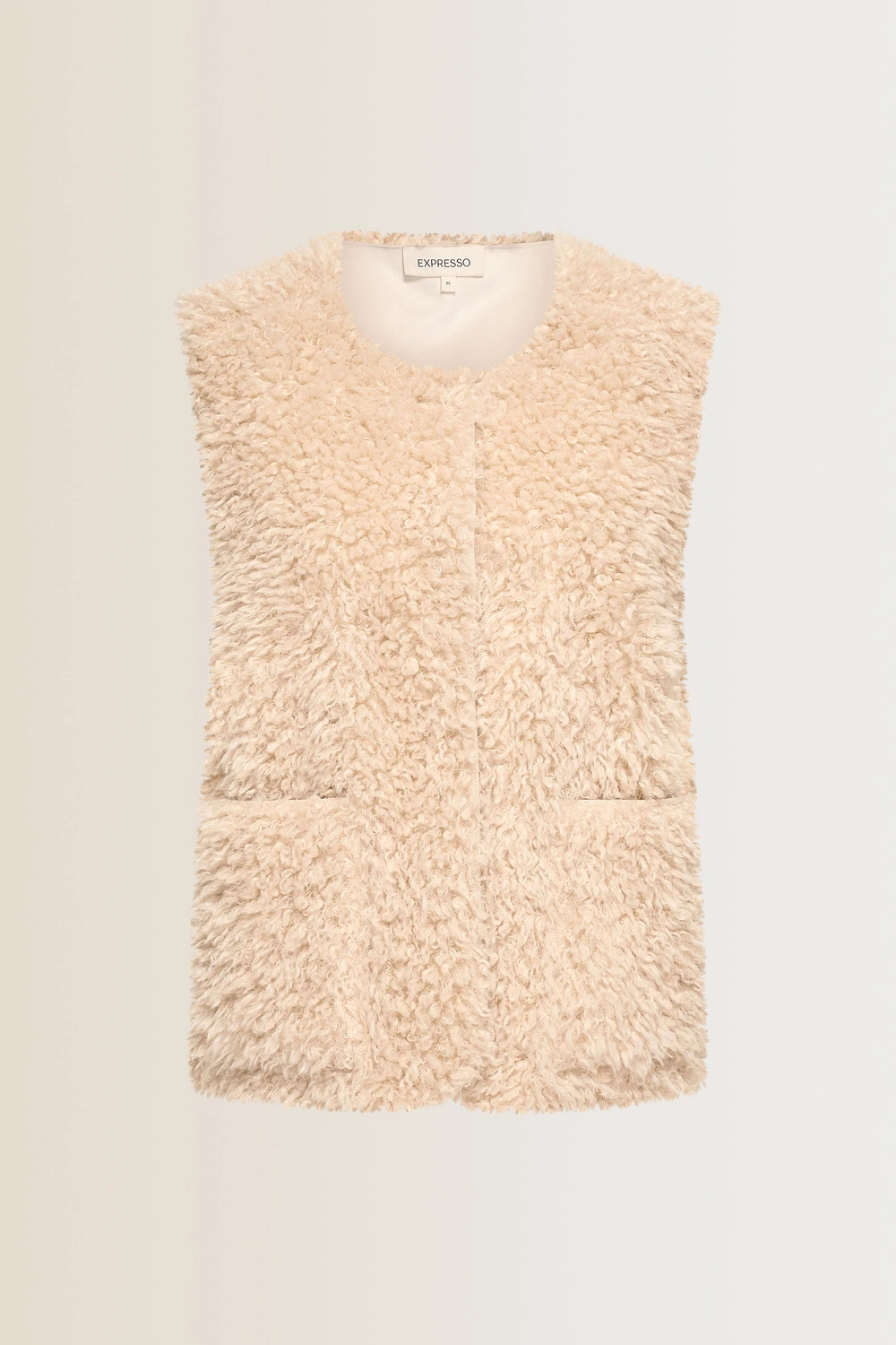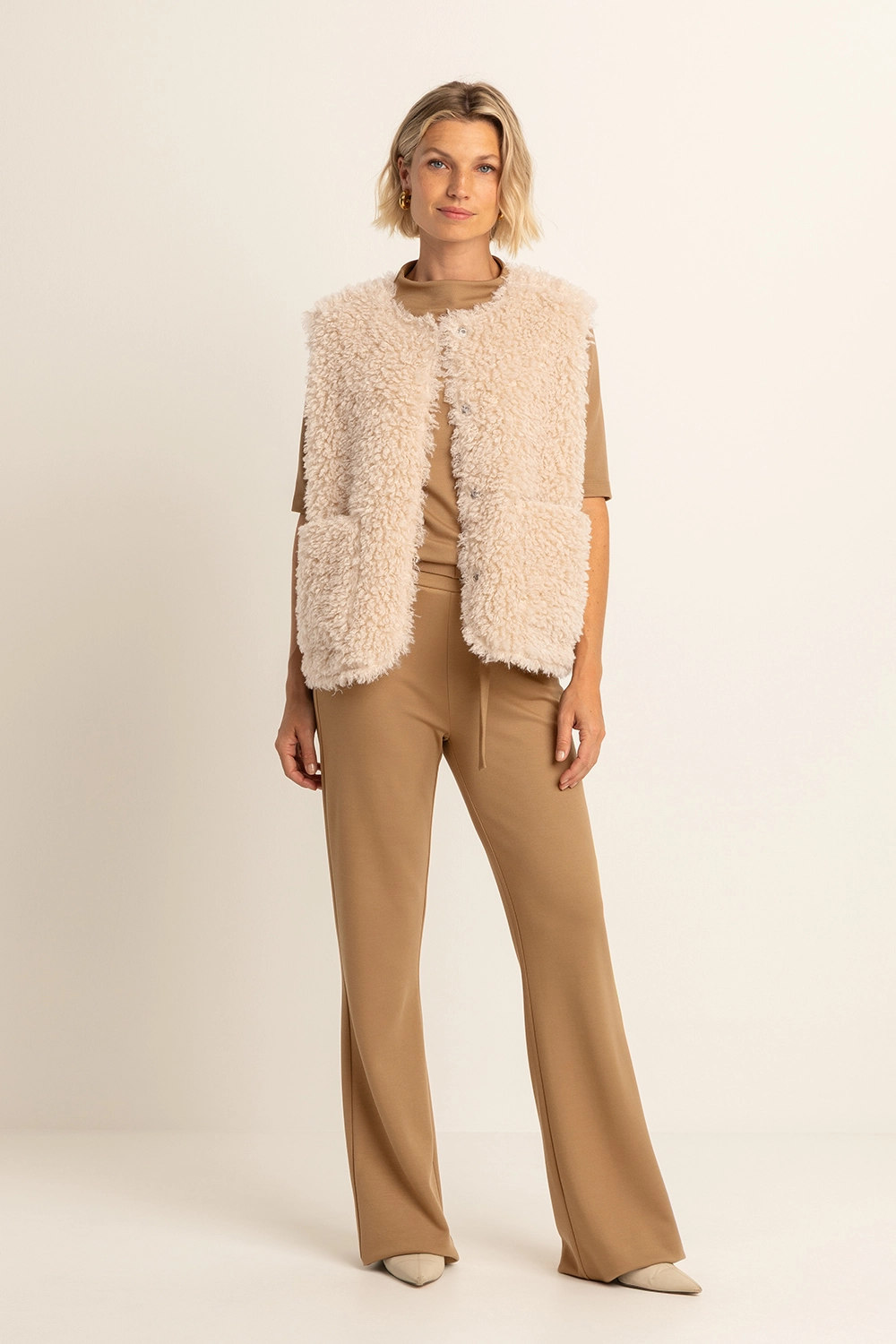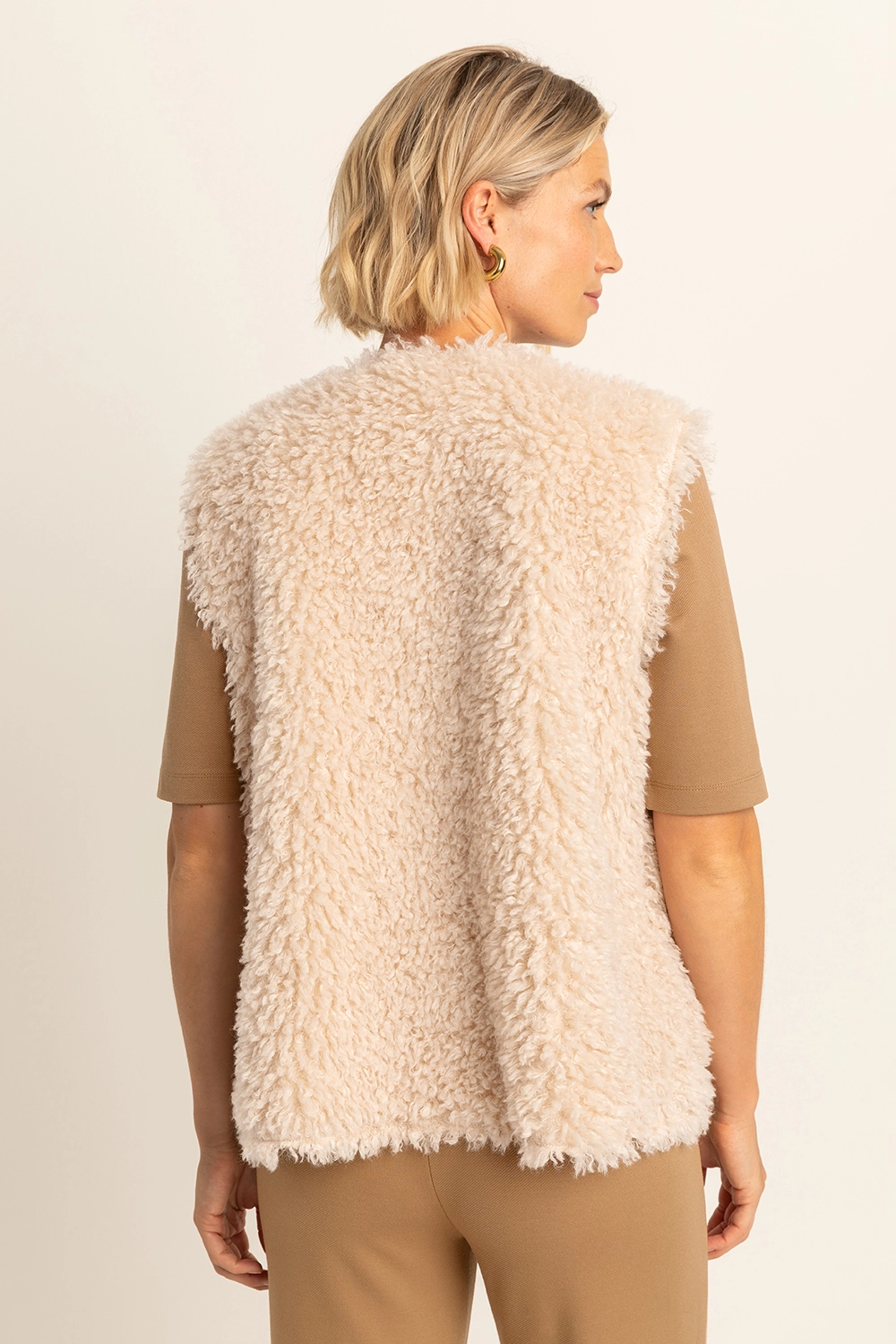 Beige faux fur bodywarmer – zacht imitatiebont met een wollige structuur. Rechte pasvorm, ronde hals en open voorkant. De fluffy textuur geeft elke outfit een luxueuze en speelse touch, terwijl de neutrale tint moeiteloos combineert met knitwear, blouses of jurken. Ideaal als extra laag voor een cozy look met stijl. Tip: draag over een coltrui en combineer met een leren broek voor een eigentijdse herfstcombinatie.