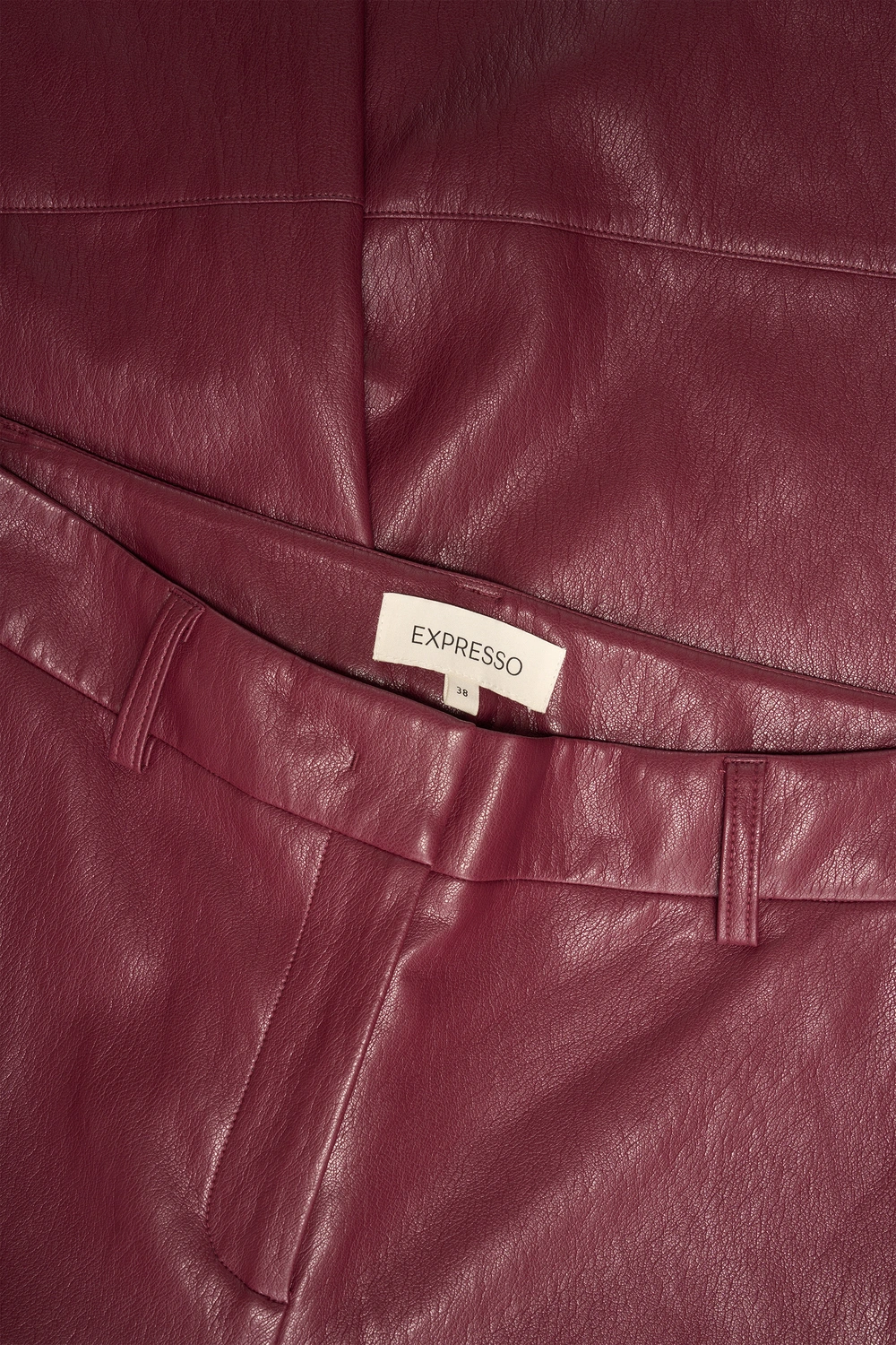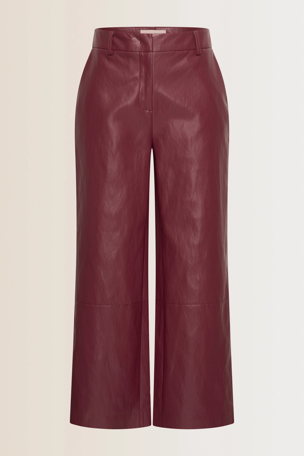 Bordeauxrode broek – imitatieleer met subtiele glans. Deze culotte met wijde pijpen is een echte eyecatcher. De soepele, imitatieleren kwaliteit voelt zacht aan en beweegt comfortabel mee. Met hoge taille en nette paspelzakken oogt de broek modern én elegant. Draag met een gebreide trui of een satijnen blouse voor een krachtige, stijlvolle look.