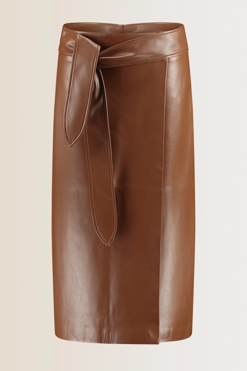 Bruine overslagrok – soepel imitatieleer met subtiele glans. Midilengte, met brede tailleband en strikceintuur die je taille mooi accentueert. De flatterende A-lijn valt soepel rond het lichaam en geeft iedere outfit een krachtige, vrouwelijke uitstraling. Perfect voor een dag op kantoor, een diner of een avond uit. Brede tailleband met strikceintuur