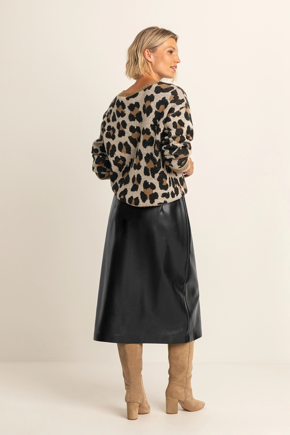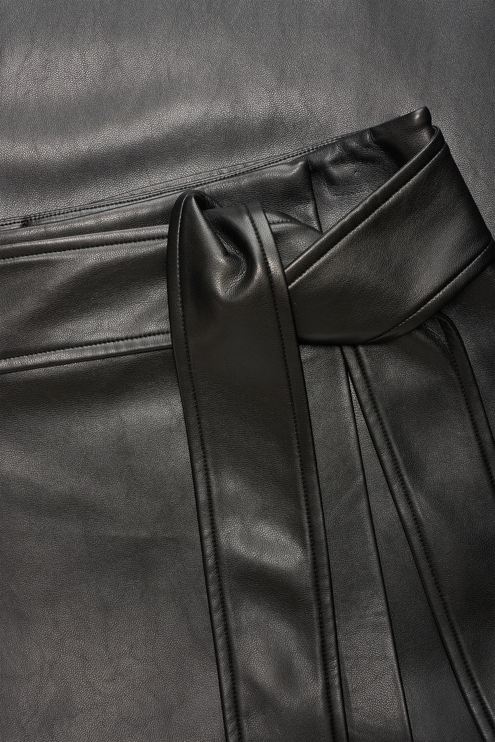 Zwarte overslagrok – soepel imitatieleer met subtiele glans. Midilengte, met brede tailleband en strikceintuur die je taille mooi accentueert. De flatterende A-lijn valt soepel rond het lichaam en geeft iedere outfit een krachtige, vrouwelijke uitstraling. Perfect voor een dag op kantoor, een diner of een avond uit.