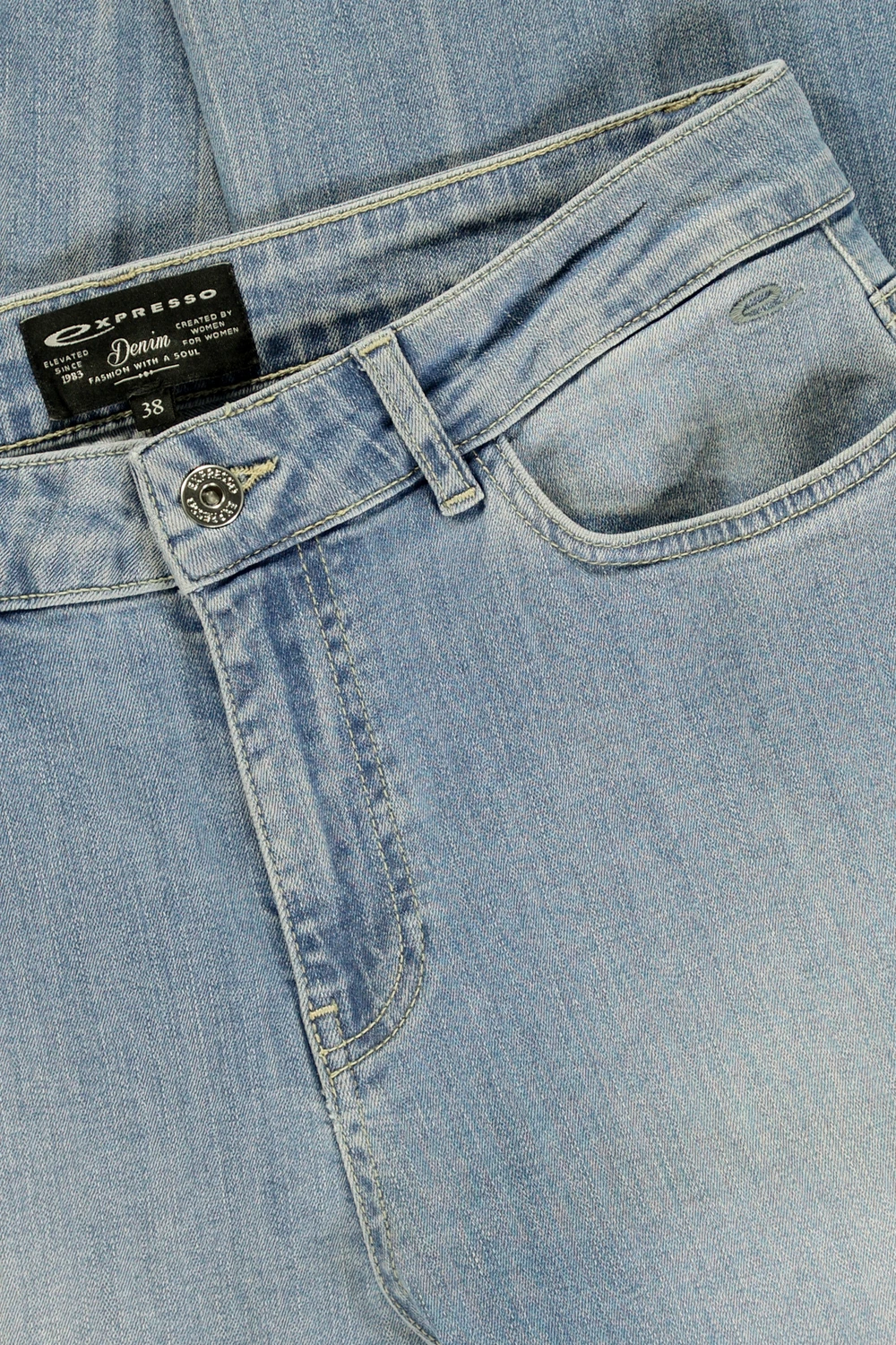 Lichtblauwe flared jeans – stretchkatoen. 5-pocket stijl, glad rond de heupen, flared vanaf de knie. Comfortabele stretchdenim, gebleekte wassing.Draag deze ‘nette’ denim met persvouwen gerust naar kantoor! Een bijzonder detail aan deze jeans is de verwassen label afdruk aan de achterkant van de jeans, hierdoor wordt het vintage effect van de broek versterkt.