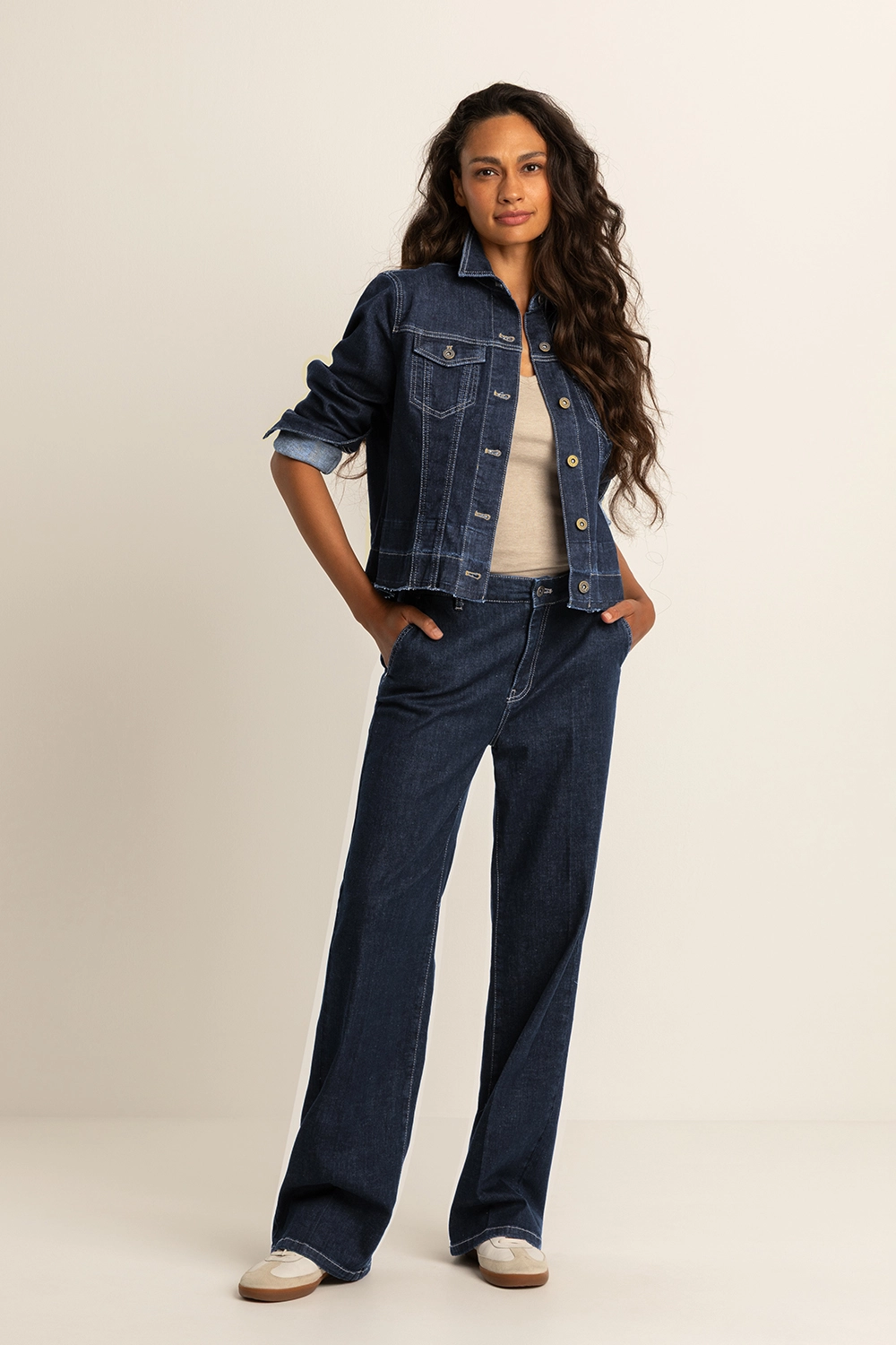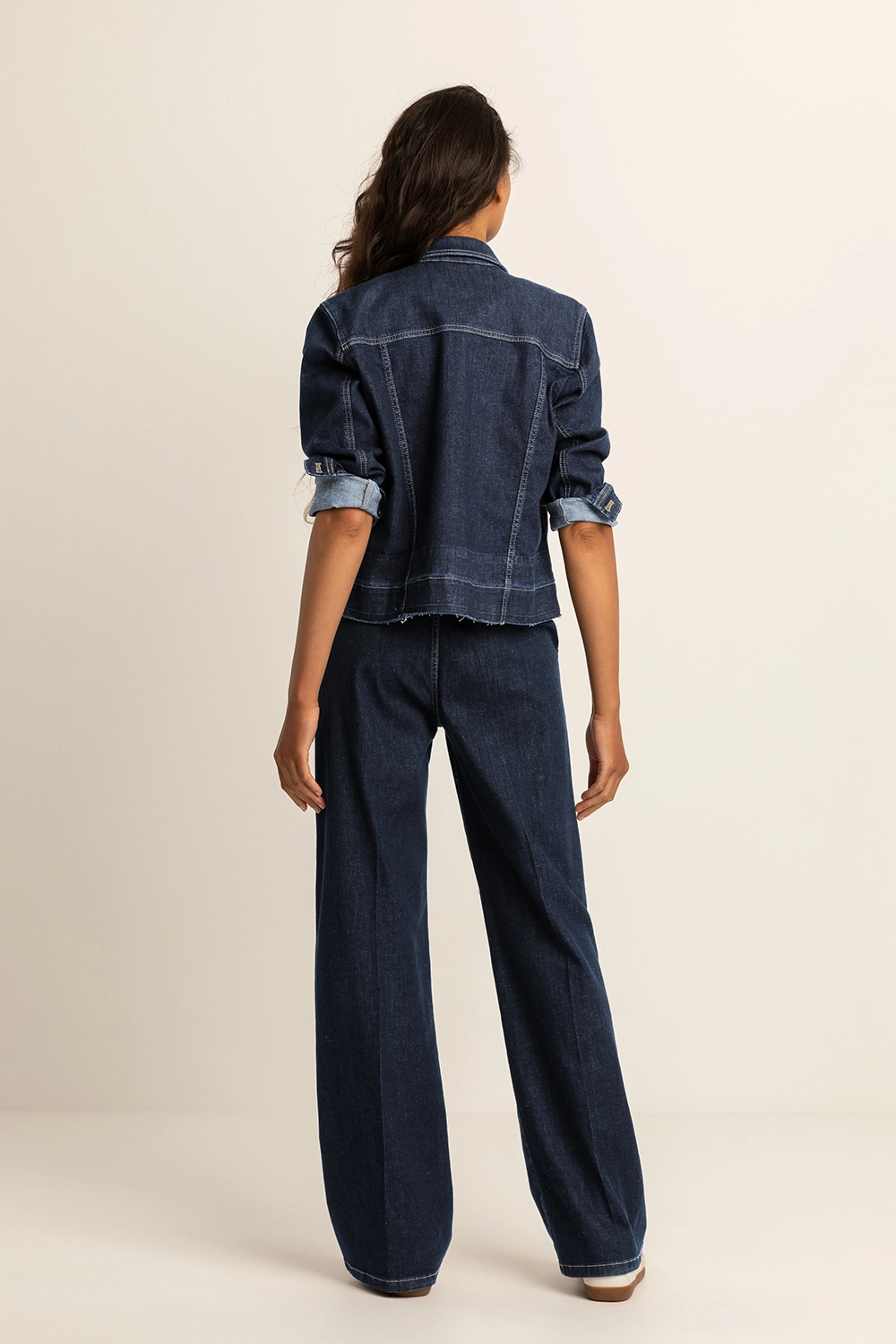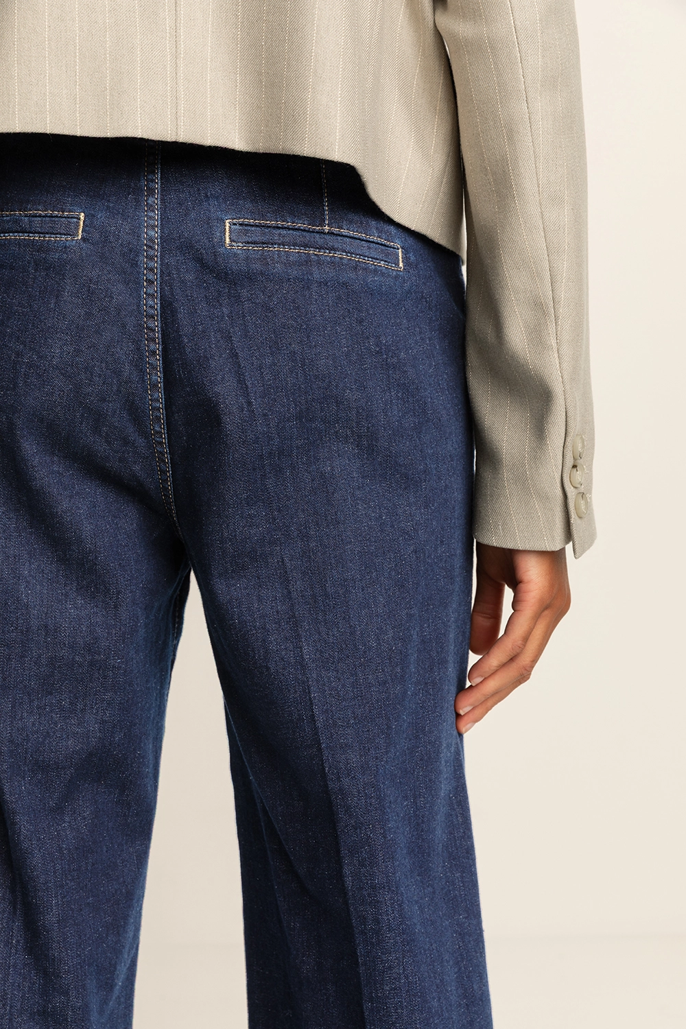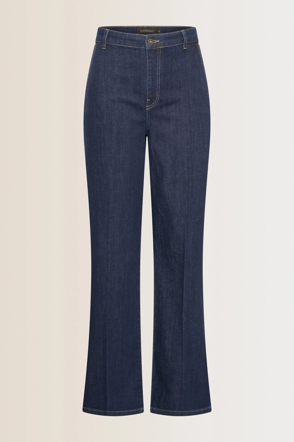 Donkerblauwe flared jeans – zachte denim met stretch voor extra comfort. Deze high rise jeans sluit mooi aan rondom de heupen en loopt vanaf de knie licht uit. Dit ontwerp is voorzien van ton-sur-ton stiksels. Ideaal voor zowel werk als weekend. Stijl met een blazer en loafers voor een city chic look.
